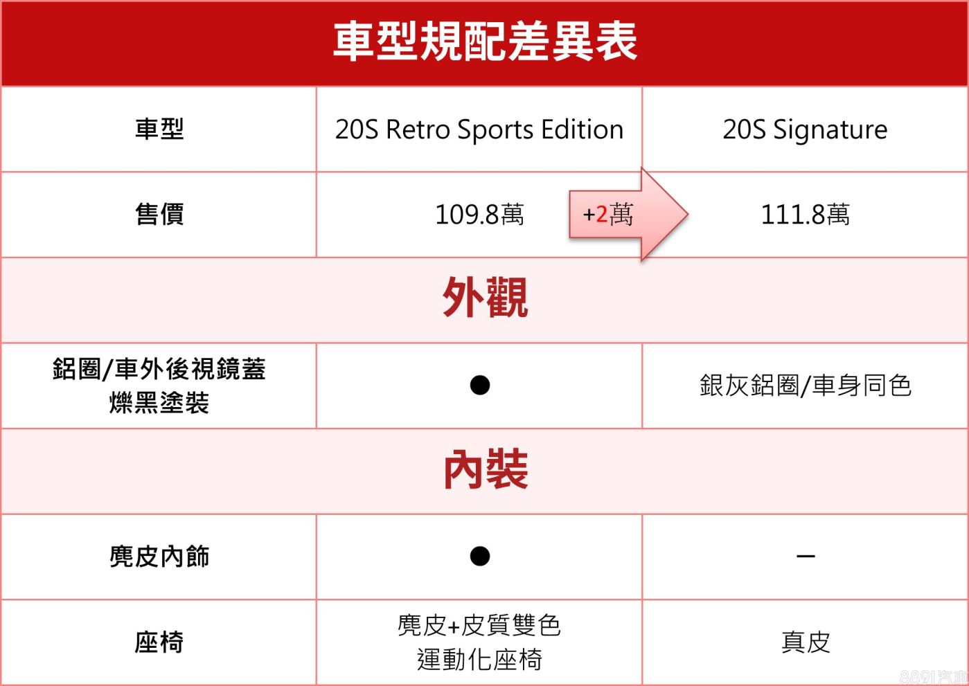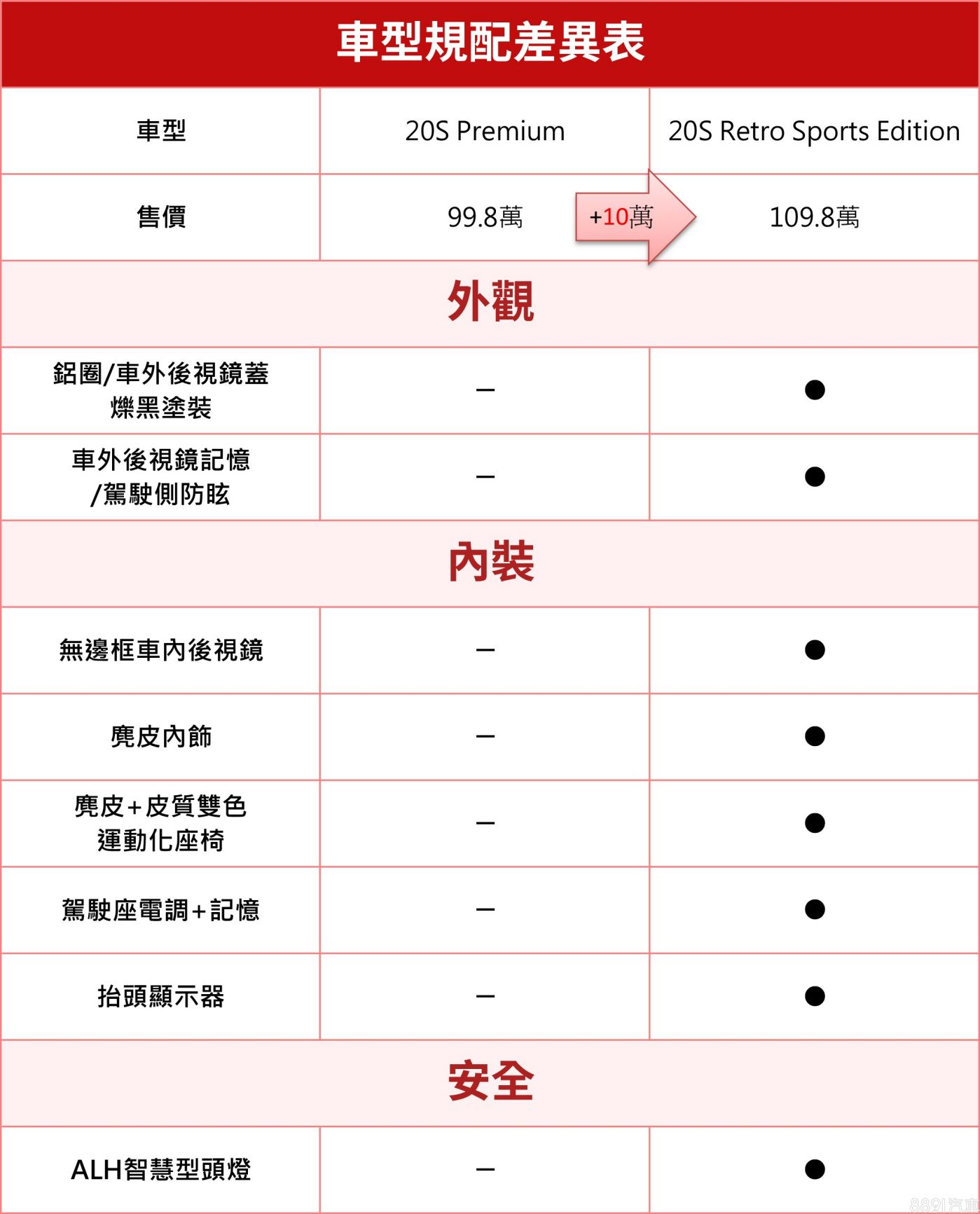 Retro Sports Edition以上版本,常見消耗品如火星塞、來令片、雨刷與燈組都維持與其他車型一致價格,僅後視鏡因為多出防眩功能稍貴一些,很意外的是Retro Sports的鋁圈竟然還更便宜。非消耗性零件方面,即便前保桿、葉子板等板件損壞,零件費用也在合理範圍內,修起來不會爆預算。