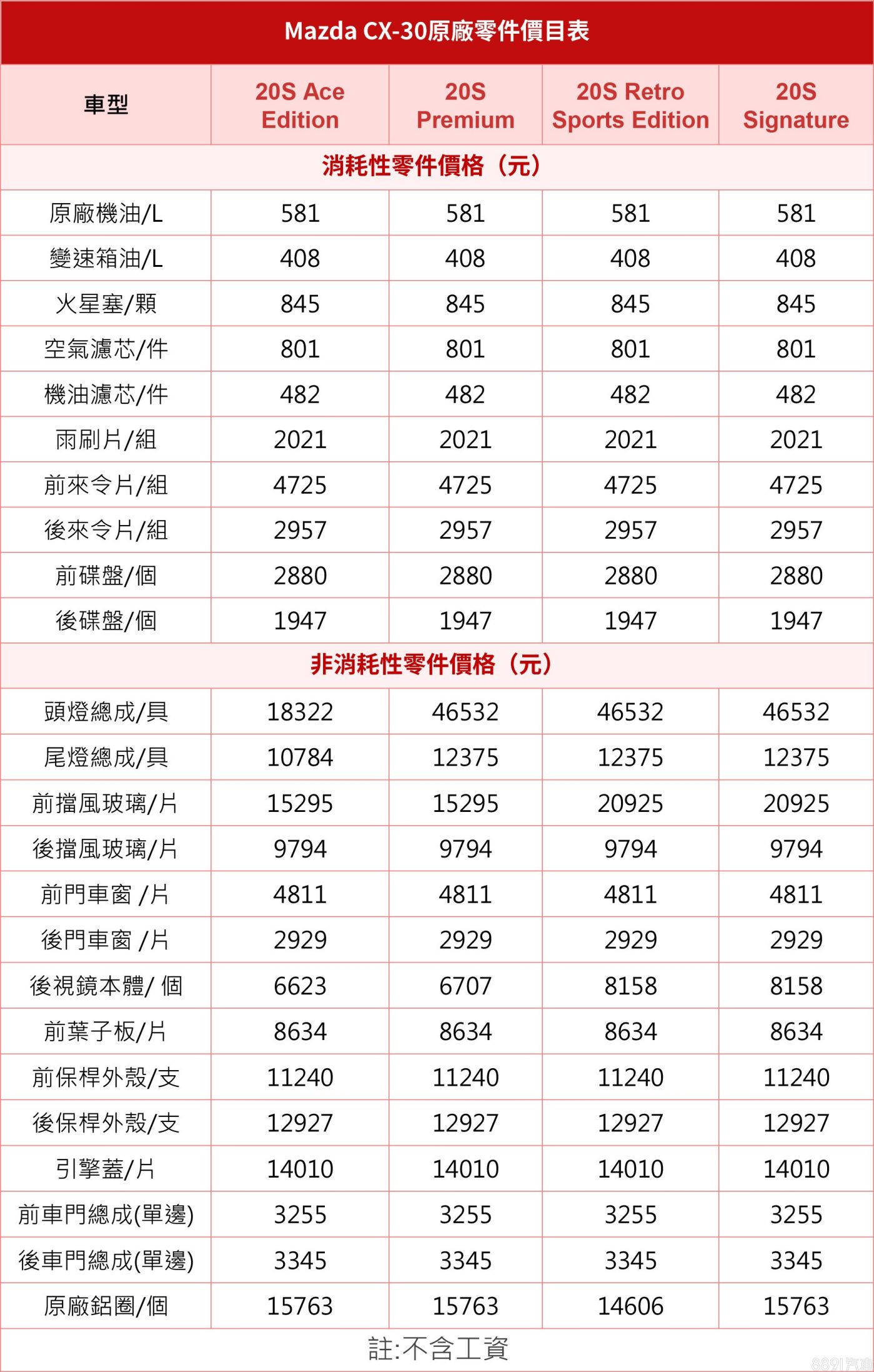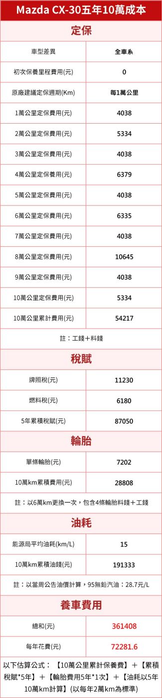 以百萬級中型SUV來說,CX-30的平均用車花費屬於溫和區間,且採用自然進氣引擎,無渦輪維修負擔,保養也相對簡單。對於長期持有、重視總持有成本的買家來說,是相當理性的選擇。