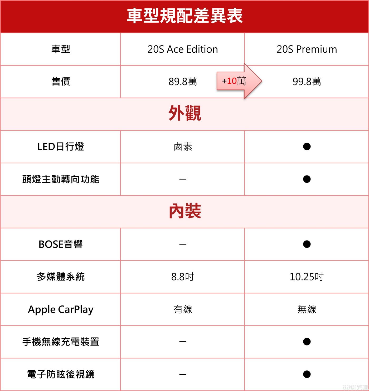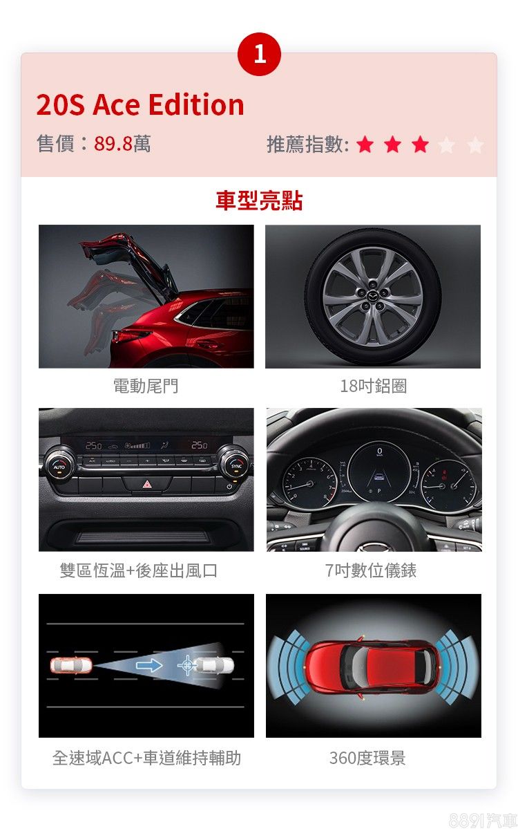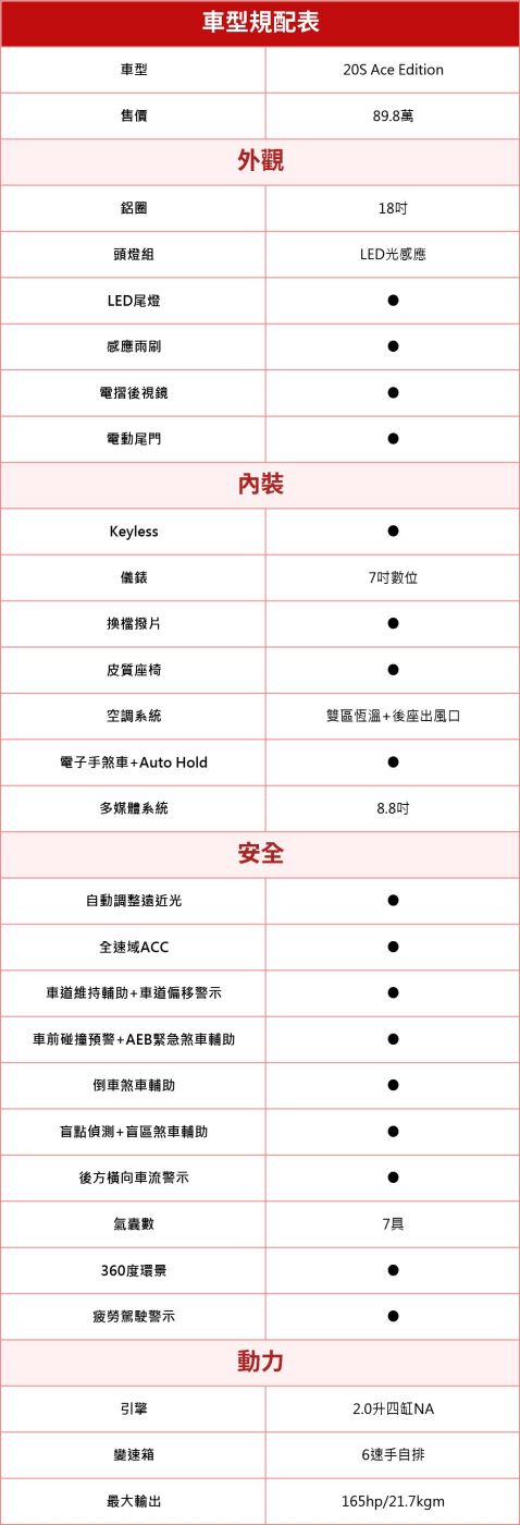 不到90萬的Ace Edition其實就配好配滿:ACC、360環景、雙區恆溫與電動尾門一樣不少,價格入門比以往便宜,是預算有限買家的首選。只是少了HUD與高級內裝,科技感略弱。
