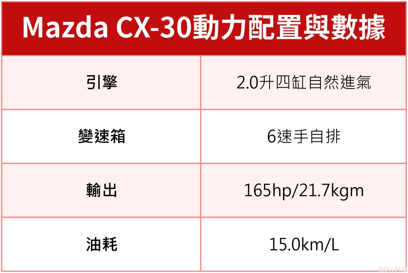 與多數對手採用渦輪動力不同,CX-30維持2.0L自然進氣引擎+6速手自排,最大輸出165hp/21.7kgm,雖不是性能導向,但傳動效率穩定、油耗表現穩健,長期養護也簡單。