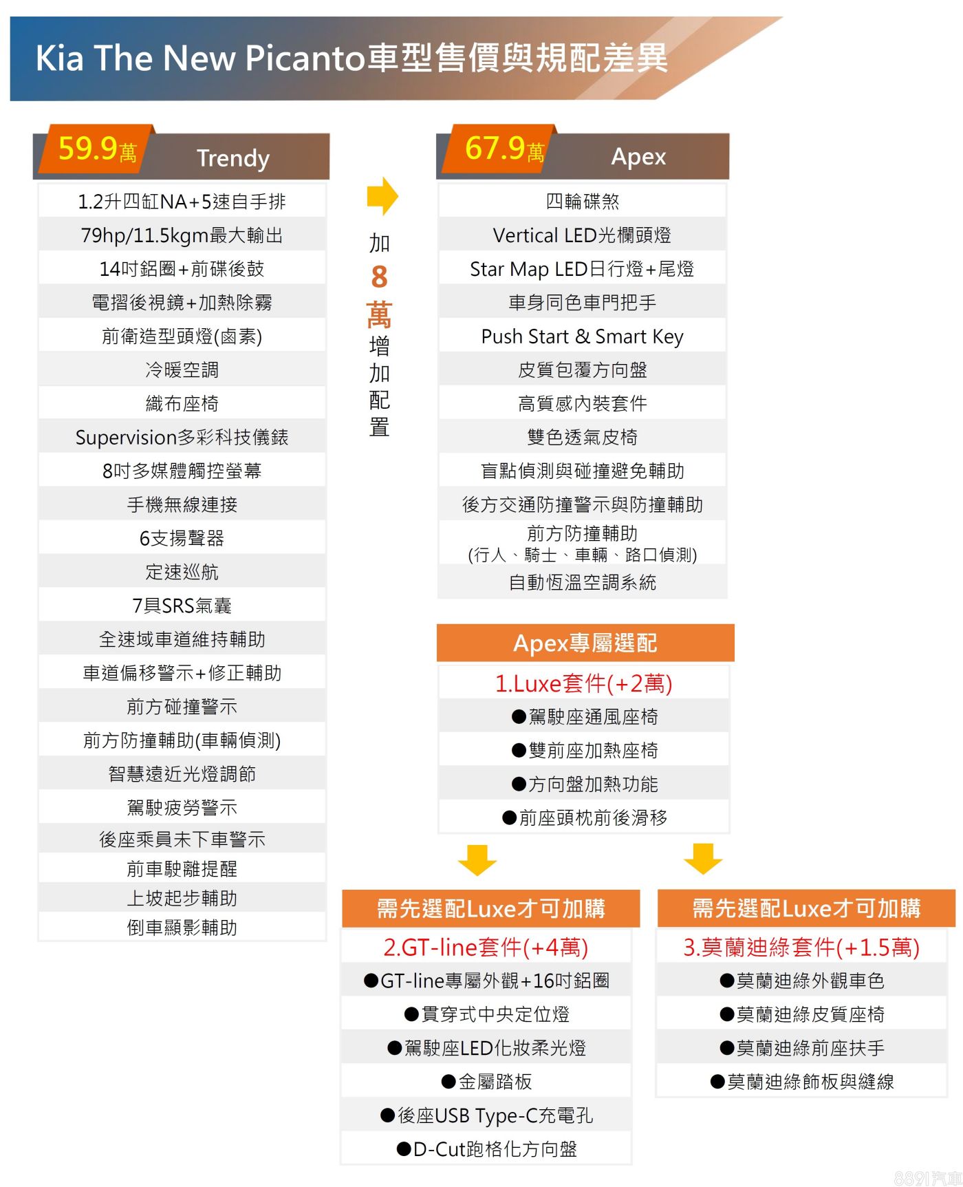 尺碼嬌小、動力適切,加上不到60萬的入手門檻,Picanto一直以來都很適合推薦給小資男女,抑或是厭倦日曬雨淋騎車或擠大眾運輸的通勤族。如今二度小改「玩很大」,不僅帶來嶄新外觀、內裝細節鋪陳、安全配備升級,還有如同高級車的多項進階選配套件,開放車主「我獨自升級」,車格小歸小,但各方面表現讓人驚艷,說是韓系Mini一點也不為過!二度小改The new Picanto動力不變,規畫Trendy和Apex兩款車型,分別開價59.9萬與67.9萬,入手門檻「60萬有找」,依舊拿下「台灣最易入手進口車」的頭銜。值得一提的是新增3大進階套件,有舒適取向的Luxe、也有運動風GT-line,以及最潮設計的莫蘭迪綠選配套件,讓消費者依預算及需求,自主選擇升級與否。