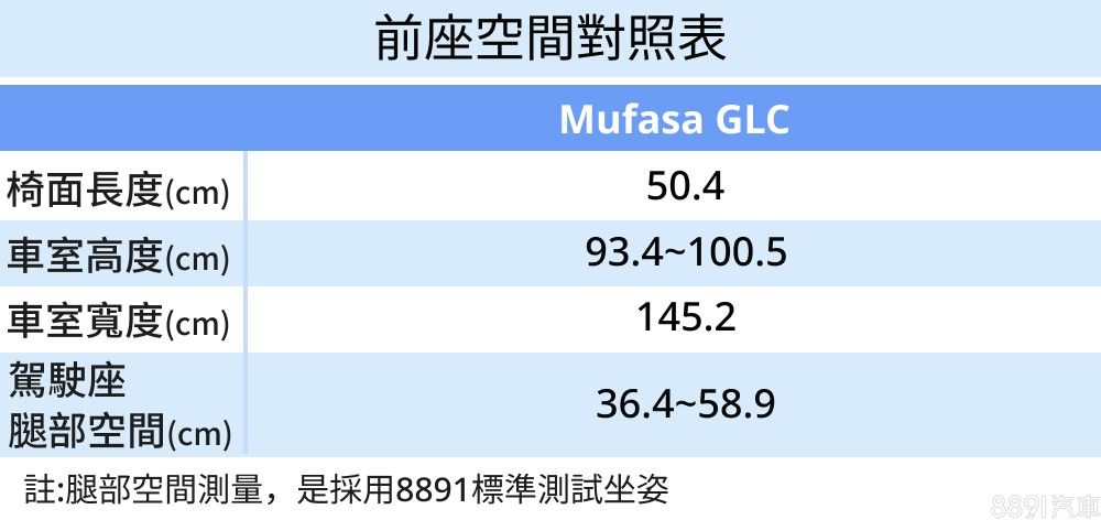 Mufasa在前座空間表現上,不論寬度、高度都出色,對照之前做過超級測試的Honda CR-V數據上相差無幾,在略小於中型休旅的車格條件下,可以營造出如此開闊感,實屬優秀。還有一個小地方值得讚賞,就是長達50.4cm的椅面長度,對於大腿支撐有幫助,可以讓長途駕駛減輕疲勞感。