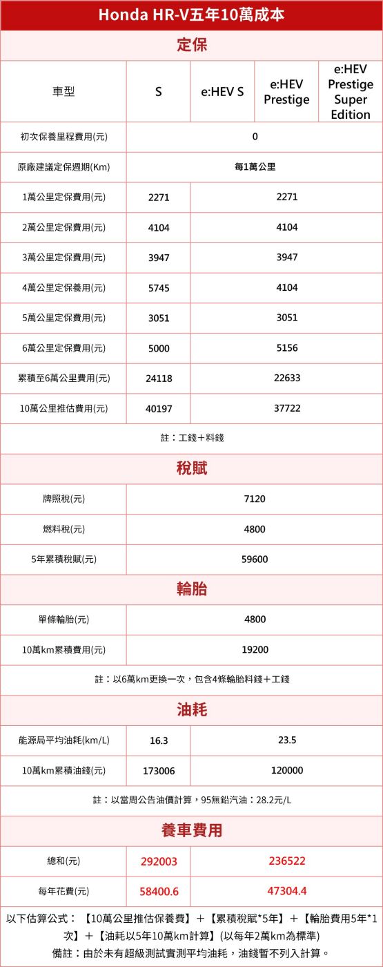 參考原廠提供的資料,HR-V建議每1萬公里回廠保養,兩版本排氣量皆為1.5L,稅金級距相當,不過e:HEV不僅定保花費較便宜,一大優勢是平均油耗23.5km/L,在油錢支出上也更省,若是有頻繁用車的車主,相信油電版會是不錯選擇。