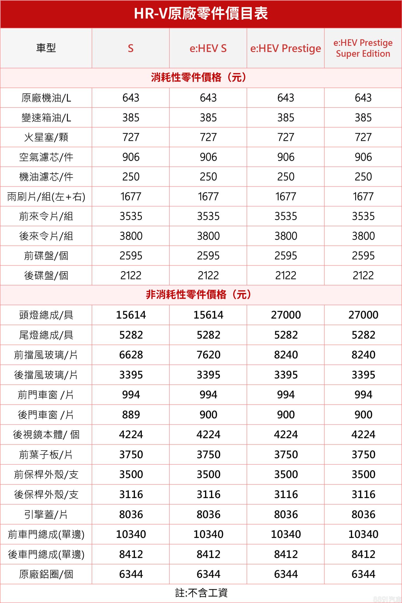 HR-V消耗性零件部分,汽油與油電版沒有價差,都符合國產車正常報價;非消耗性零件也幾乎相當,比較明顯的差異是Prestige版以上,頭燈多了序列式方向燈+鍍鉻飾環,因此若需要更換頭燈總成時,所需要負擔的成本自然也較高。