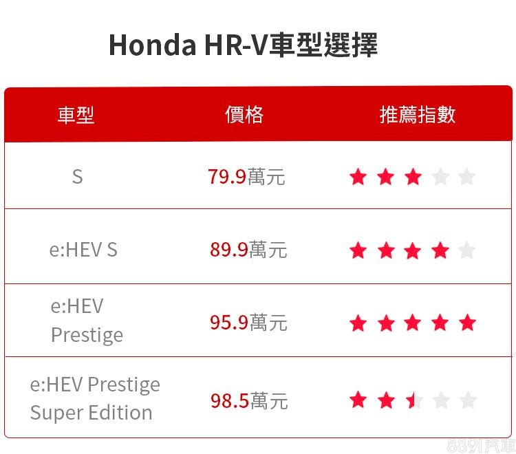 小改HR-V在原有汽油動力外,追加e:HEV油電款,且定價算有誠意,汽油升級油電只要10萬,我們認為很具吸引力,既能享受如同電動車的科技感,油錢與保養也比汽油版更省,直上e:HEV動力無懸念,不過最推的會是Prestige車型,多了一堆實用配備與安全輔助,個人用車體驗加分外,載家人出遊也更放心!