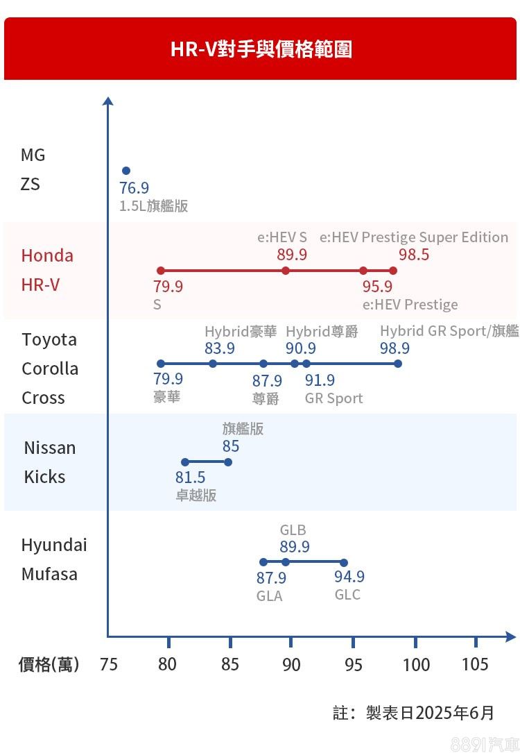 HR-V位處競爭激烈的國產CUV級距,各家廠牌對手眾多,多數車款定價落在80~100萬之間,其中HR-V與Corolla Cross均有提供汽油與油電雙動力,目標客群一致,且起始價與價格帶相當,正面對決「神車」的意味濃厚!