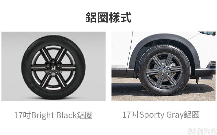 HR-V全車系均搭載17吋五輻鋁圈,不過配色上略有不同,汽油版是「Bright Black」的深黑色款,搭配白色飾條拉出對比;油電版則配「Sporty Gray」灰色款。