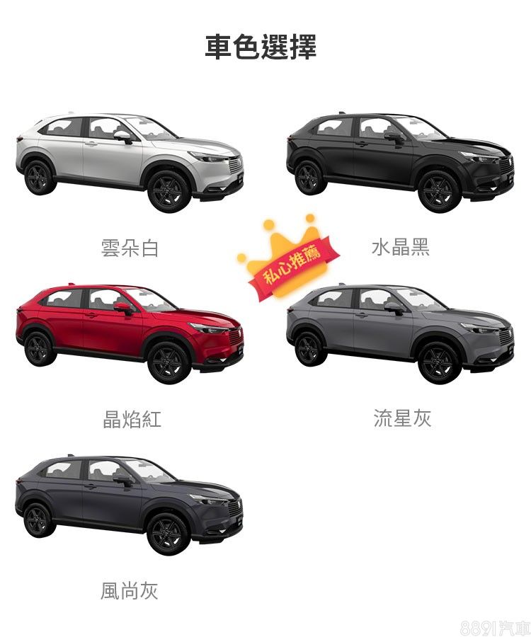 HR-V供應車色不多,大概除了「晶艷紅」較為鮮艷外,其他都是黑、灰、白等常見灰階色系,以鎖定年輕人為主要客群的CUV而言,選擇有些受限。個人推薦是「流星灰」,看上去類似時下流行的水泥灰,時尚又不失穩重。