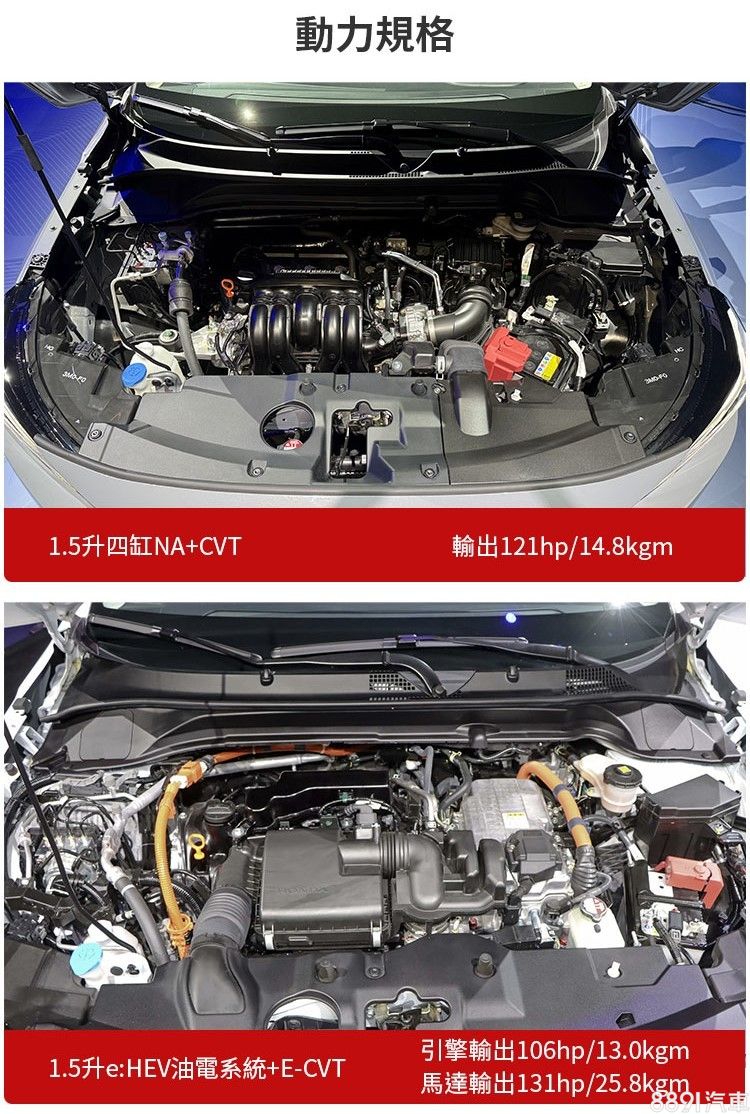 數據方面,汽油版出力121hp/14.8kgm,而油電版以1.5升四缸引擎為基礎,再加入電動馬達、鋰電池組建構e:HEV系統,不過引擎(106hp/13kgm)與馬達(131hp/25.8kgm)各自為陣,不存在「同時輸出動力」的狀態,因此也不像豐田的混聯系統,會公佈綜效最大輸出。