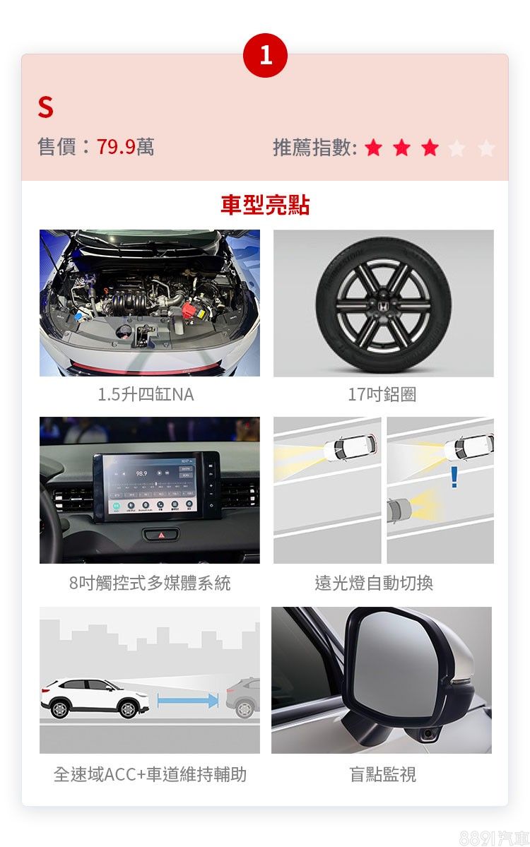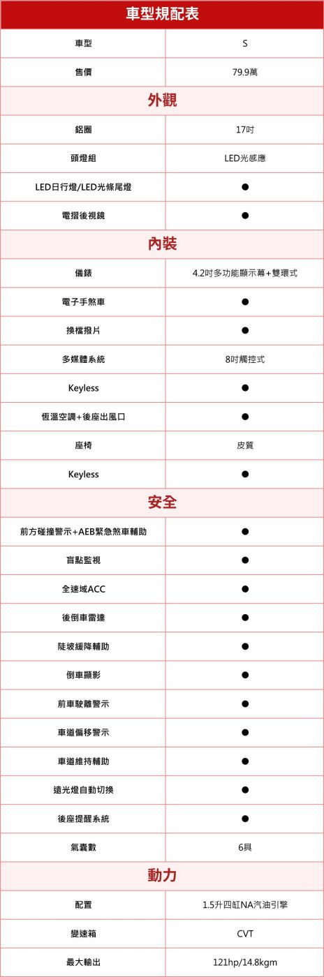汽油動力僅供開價79.9萬的S版,車系入手價比小改前還要便宜,配備較為基礎,但安全倒是不分等級,全速域ACC、車道維持輔助、遠光燈自動切換、前車駛離提醒、後座提醒系統皆列標配,鎖定的會是預算受限的首購族或小家庭。