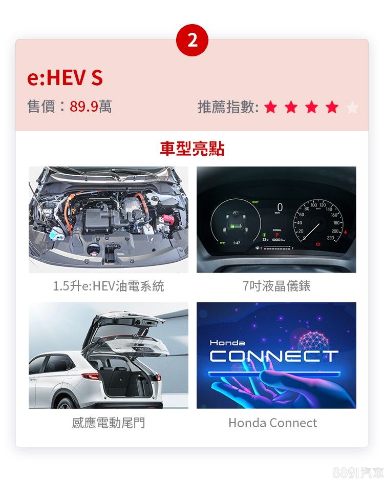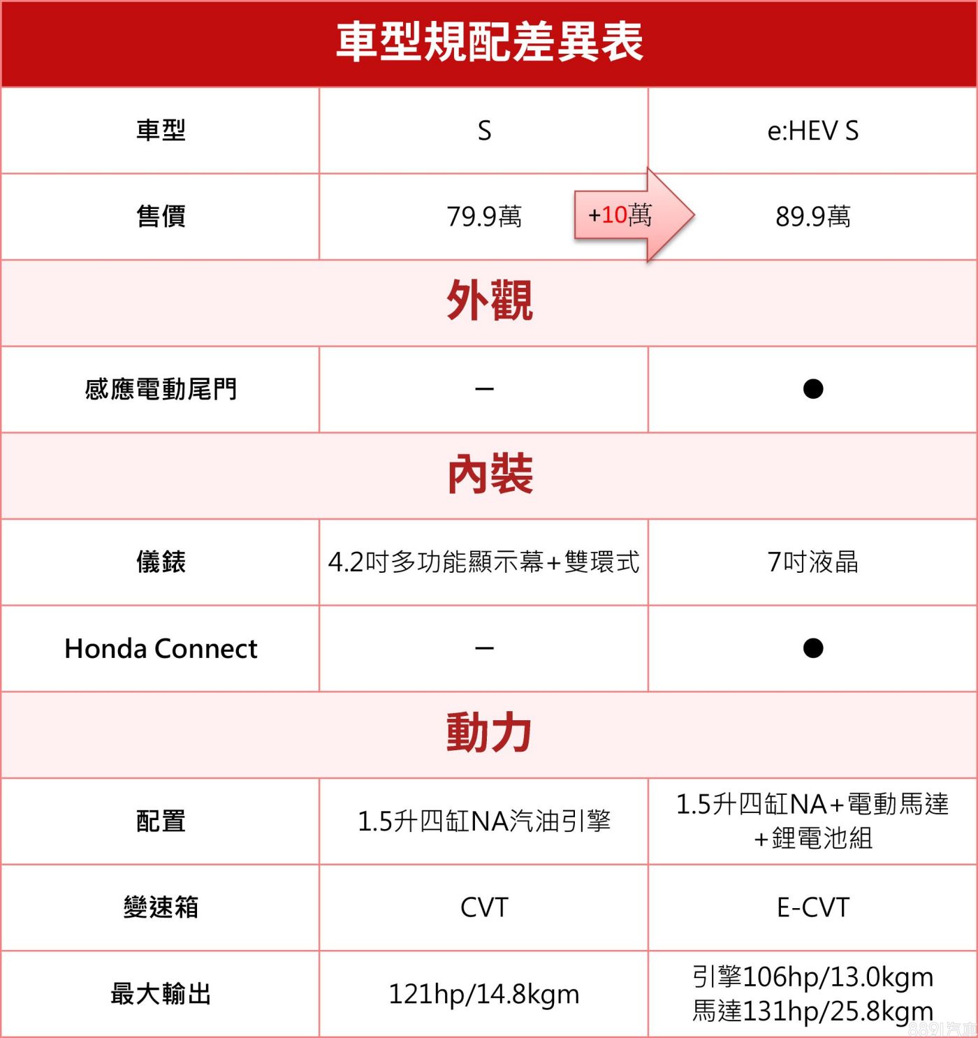 升上e:HEV S二階車型,一來是改搭e:HEV油電動力,享受電驅科技,無須擔心里程焦慮與充電問題,同時油錢也更省,二來是增加電動尾門、7吋數位儀錶、Honda Connect車聯網等配備,科技感與實用度都提升,以10萬的價差來看絕對超值!