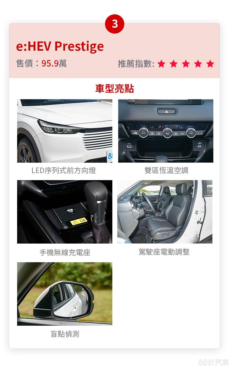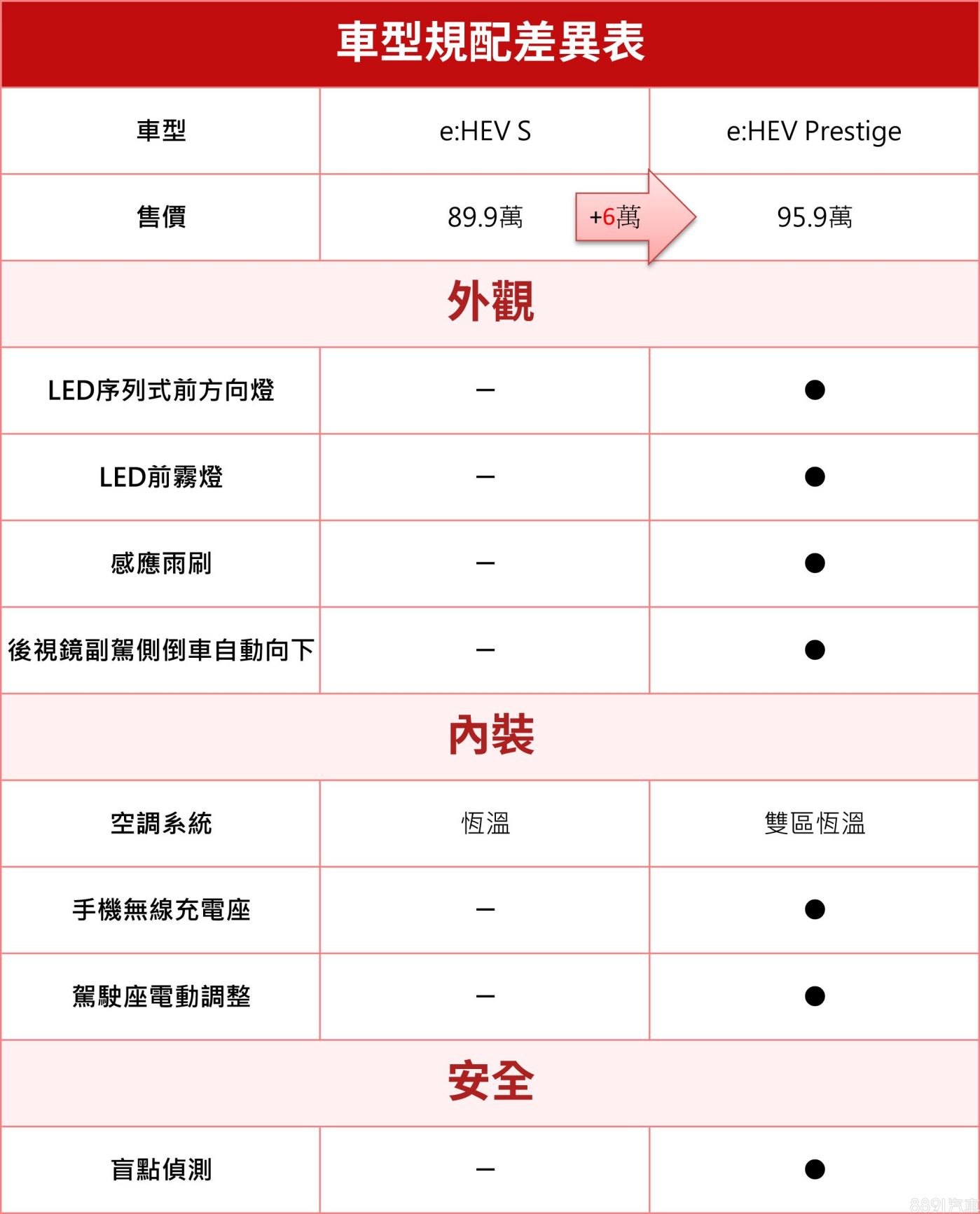 不過我們認為再多花6萬的e:HEV Prestige,性價值最高。新增LED序列式方向燈、LED前霧燈、感應雨刷、倒車後視鏡自動向下、手機無線充電、駕駛座8向電調、雙區恆溫、盲點偵測等等,上述不少配備較難透過售服配件取得,原裝整合度高,且用車體驗與安全輔助上都有加分,榮登我們的五星推薦。