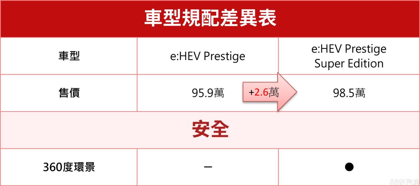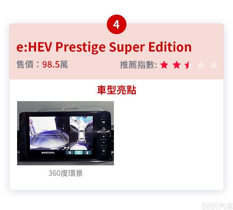車系頂規的e:HEV Prestige Super Edition,多了前置+兩側後視鏡鏡頭,構成360度環景攝影,能在停車或會車時,提供視野輔助。不過加價2.6萬有點小貴,且這配備需求也是因人而異。