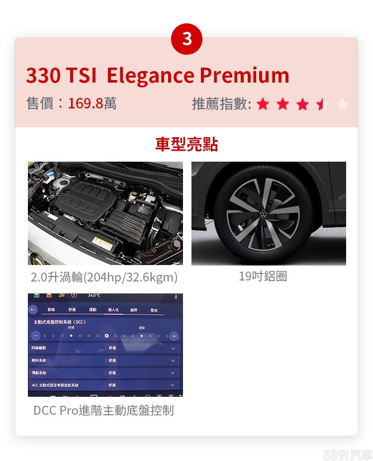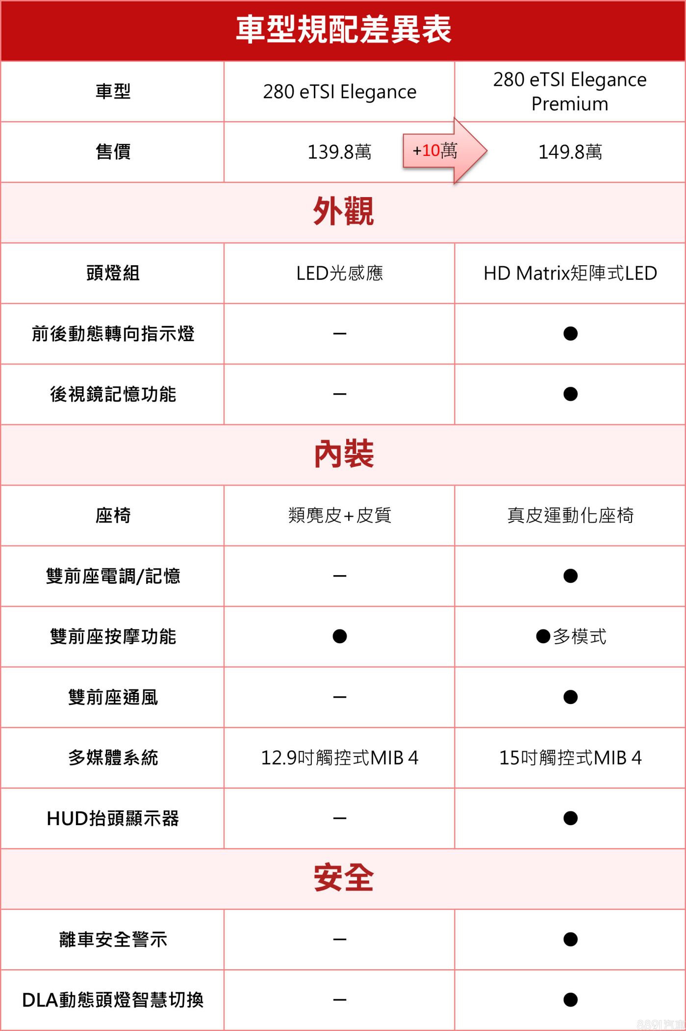 一樣是Elegance,多了「Premium」就是有感升級了,多10萬元升級,除了加入了15吋大螢幕之外,高階燈組多了DLA動態頭燈功能,可以主動遮蔽光型,電動調整真皮座椅還有多模式按摩功能,主要的科技配備已全數到齊,讓你不用直上2.0動力,就能享受大改款Tiguan的精隨。