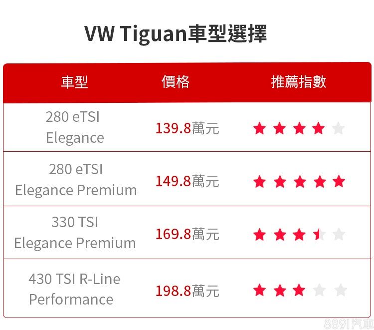 Tiguan配備最齊全,動力選擇也多元,不論是求個實用,還是喜歡性能都有對應版本,因此價格帶涵蓋廣泛,不僅能下打日韓同級進口SUV,更能觸及歐系5+2座產品,甚至與豪華品牌如Lexus NX產生交集,顯示Tiguan在市場定位與產品力兼具的優勢。
