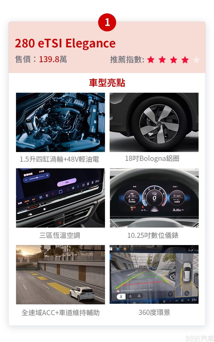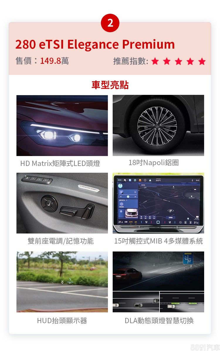 從配備完整度、價格落點到日常使用需求來看,280 eTSI Elegance Premium就是大改款Tiguan最划算的版本,不僅一次到位配齊HUD、15吋中控大螢幕與MIB 4系統,還具備雙前座通風電調與真皮運動座椅,大幅提升乘坐舒適度。1.5升輕油電動力結構在保有足夠扭力表現的同時,也享有稅金與油耗優勢,讓人用得安心、養得輕鬆。