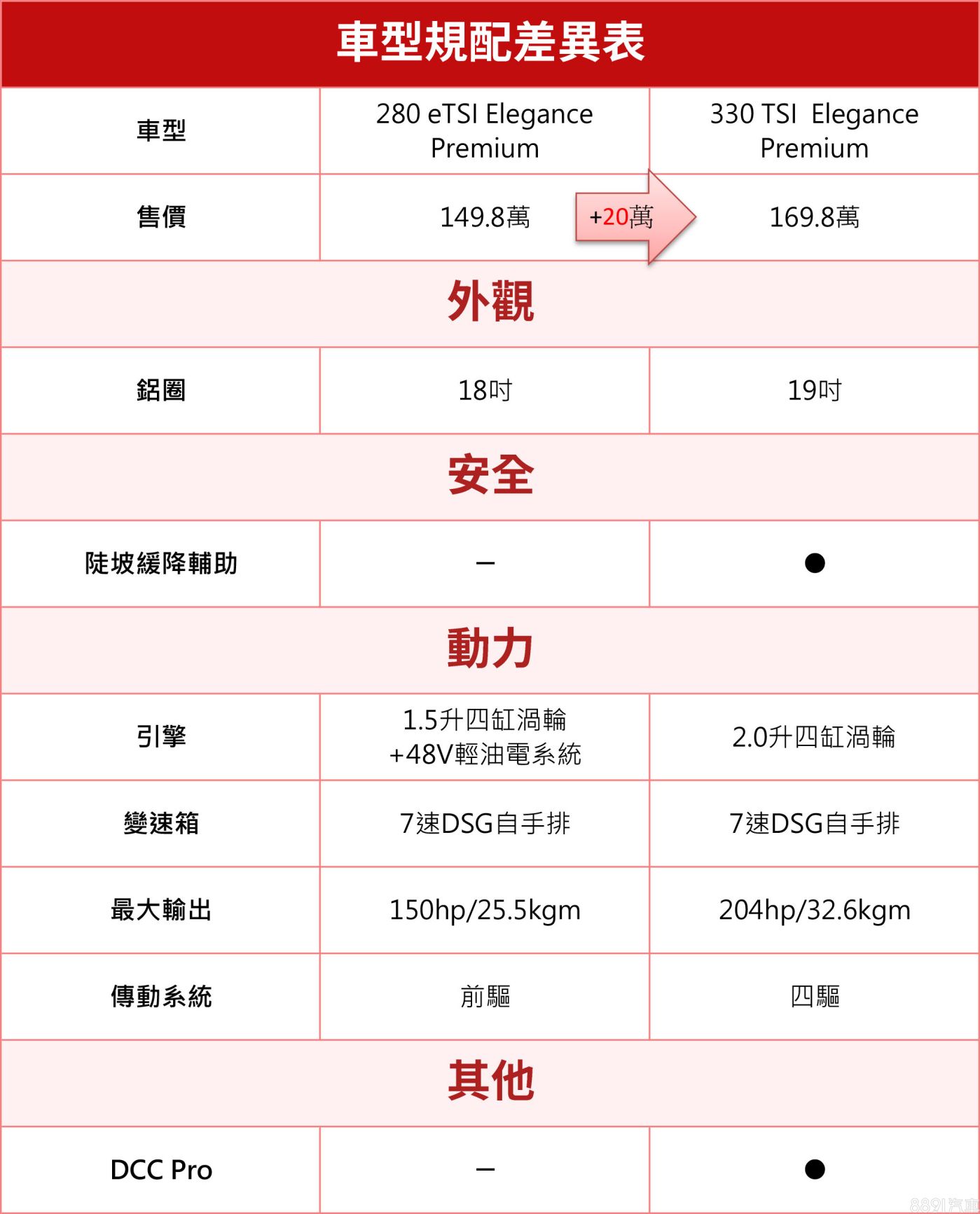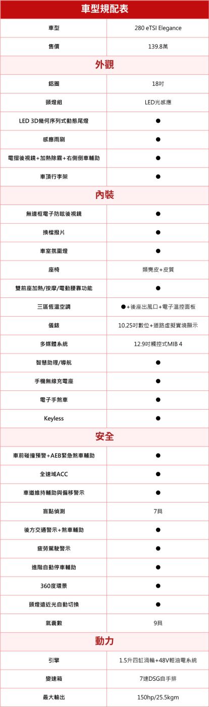 2.0升動力全數搭配四驅系統,其中430 TSI更具備265hp、0~100km/h僅5.9秒的加速實力,適合追求性能表現的買家。相對地,1.5升輕油電動力更面向普羅買家,不僅稅金、油耗經濟,25.5kgm的扭力表現也讓一般通勤毫無壓力,是實用、划算的選擇,若沒有極端性能需求,選擇280 eTSI版本已非常夠用。