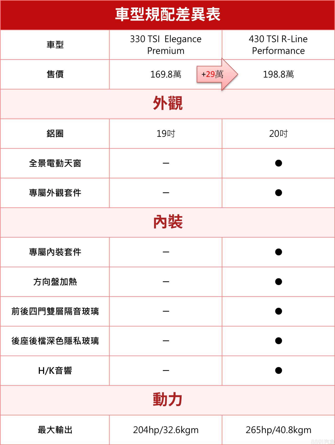 買頂規就是為了性能,身懷265hp動力,0~100km/h只要5.9秒,這可是跟自家招牌鋼砲GTI一樣的加速表現,當然看扮相也知道,一身R-Line專屬勁裝,一副不好惹的樣貌,個性比其他版本外放許多。但是願意花198.8萬買430版本的買家,或許會想等正港的「R」推出,針對性能專屬調校更多,玩起來更加盡興!