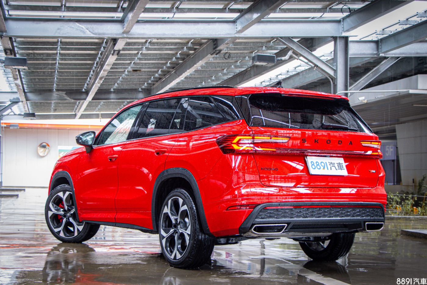 Kodiaq RS具備專屬外觀設計,前氣壩加大與兩側直立導風口相連,下擾流採用車身同色烤漆,帶來更低趴的視覺感受。水箱罩、車頂行李架、後視鏡外蓋等處均採用亮黑色烤漆,性能感受拉滿。