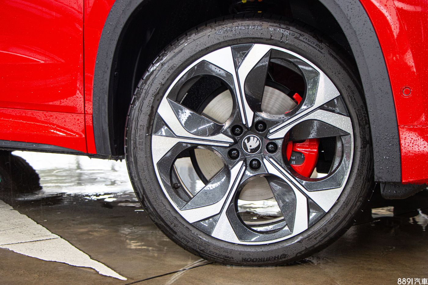 20吋鋁圈結合五幅旋風造型與洞洞框,個人認為相當好看,配胎採用Hankook Ventus Evo SUV,是帶有性能定位的街胎,尺碼235/45R20。有趣的是胎寬與入門1.5 TSI同為235mm,單純降低扁平比減少輪胎型變,20吋鋁圈也能容納更大的煞車配置。