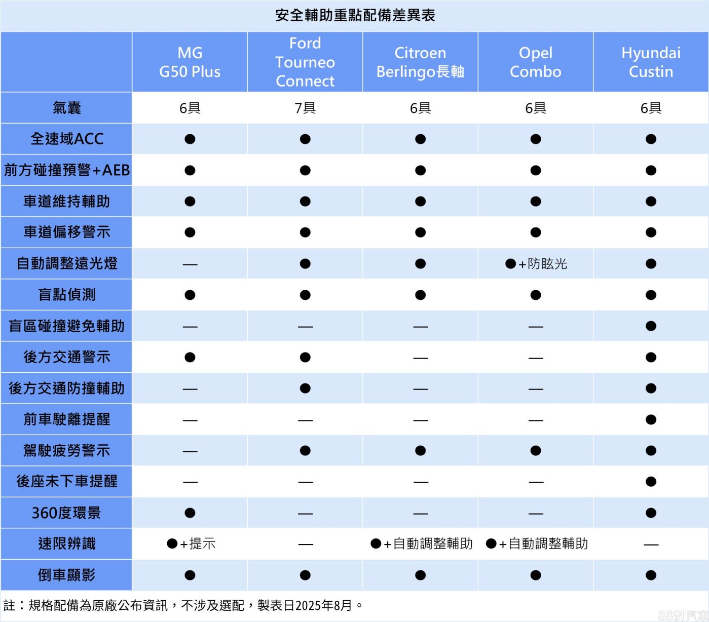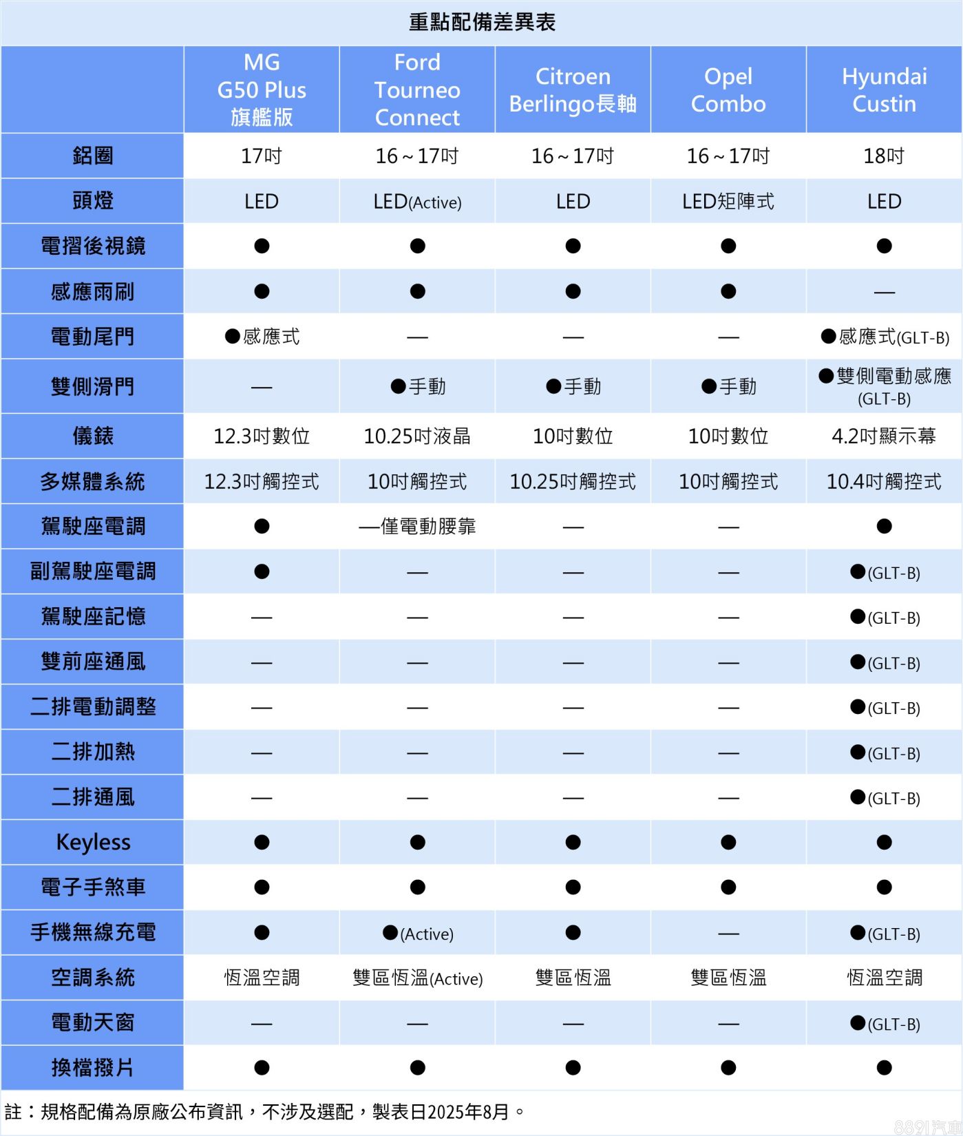 雖然都是七人座MPV,但產品取向略有差異,G50 Plus與Custin採「2+2+3」座位配置,全車採用皮椅、前排都有電調機構,且第二排都是獨立座位,有扶手可靠,更注重乘客的乘坐舒適度,而Berlingo、Combo與旅玩家皆為「2+3+2」的設定,沒有電調座椅,配備簡潔的織布座椅,不過後排可完整倒平、第三排座椅還可拆卸,空間運用更靈活,也能兼顧商車的用途。