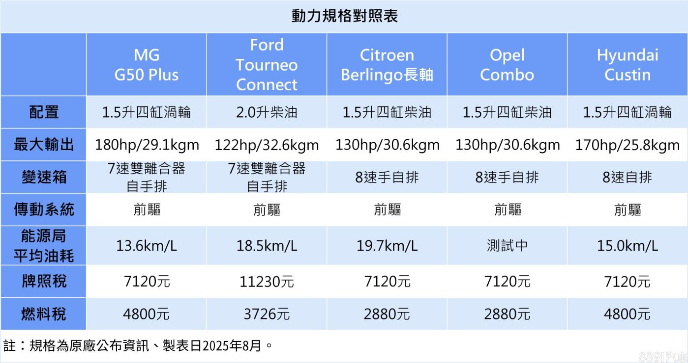 5款MPV分成汽油與柴油陣營。G50 Plus與Custin同為1.5升汽油渦輪,但變速箱型式有別,分別搭配7速自手排與8速自排,兩車輸出數據由G50 Plus勝出,Custin則是油耗更好;Berlingo與Combo互為兄弟車,都搭載1.5升柴油渦輪+8速手自排,而旅玩家則是採用2.0升柴油+7速自手排,柴油引擎的優勢是扭力更大、油耗更漂亮,同排氣量下燃料費也更省,不過相反的需定期添加尿素,也會是一筆養車成本。