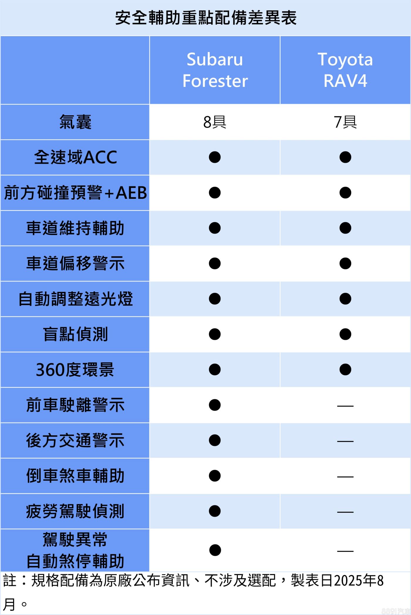 從表格來看,Forester在主動安全層面配得更滿:除核心的全速域ACC、AEB、車道維持/偏移、AHB、盲點與360環景外,還多了前車駛離警示、後方交通警示、倒車煞車輔助、疲勞駕駛偵測與駕駛異常自動緊停,氣囊數也為8具;RAV4雖標配完整TSS主動安全,但列表相比對手之下,仍是缺了不少功能,若重視被動與主動雙層守護,選Forester會更全面。
