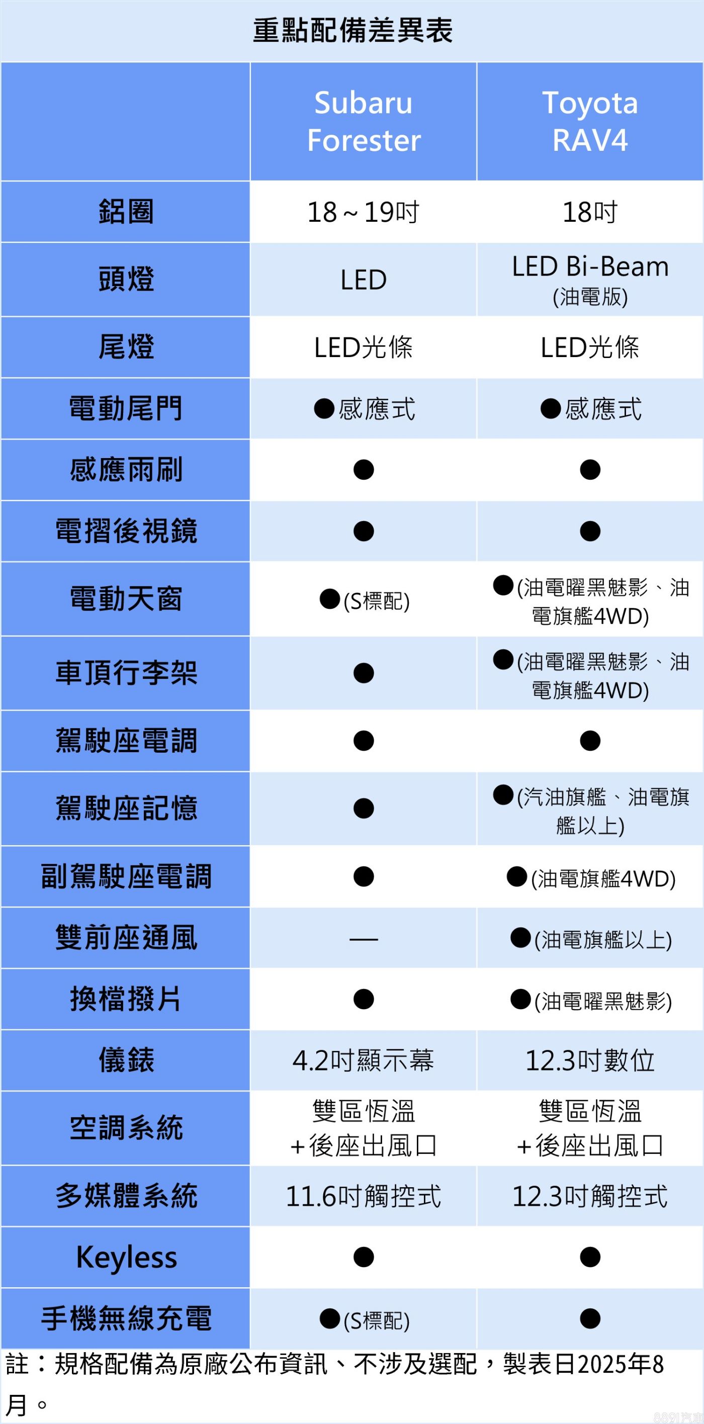RAV4在座艙科技與高階舒適上佔優,採12.3吋數位儀錶與12.3吋中控,並提供雙前座通風與LED Bi-Beam頭燈(依等級),豪華感更突出;Forester則走實用取向,18~19吋輪圈、感應尾門、感應雨刷、電摺後視鏡與行李架等配備分布更平均,且駕駛座記憶、副駕電調在多數等級就有,但儀錶僅4.2吋、螢幕11.6吋,整體科技感略遜。選購取向上,想要更數位科技與通風座椅可偏向RAV4,講求配備實用與標配完整度則Forester更合拍。