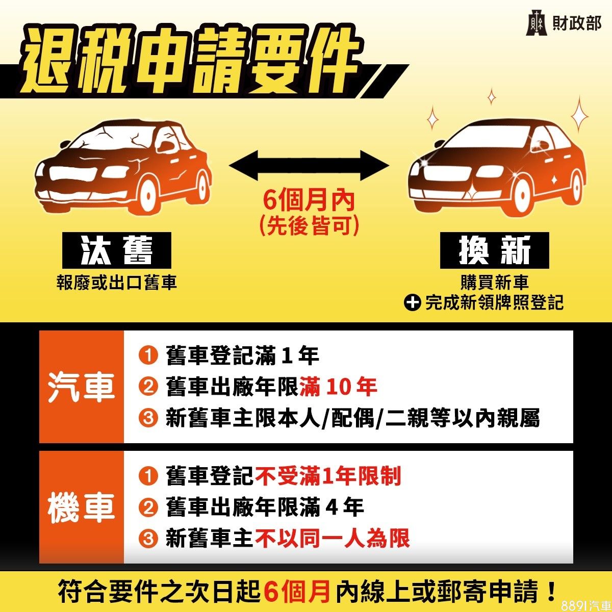 若想申請汽機車舊換新退稅,需於舊車報廢或出口前、後六個月內購買新車完成領牌,汽車要求舊車必須是記滿一年且出廠十年以上之小客車、小貨車、小客貨兩用車,且新舊車主限本人、配偶及二等親以內親屬才符合退稅條件;機車新舊車主則無限制,不以同一人為限,僅要求舊車出廠需4年以上,才能符合退稅申請要件。