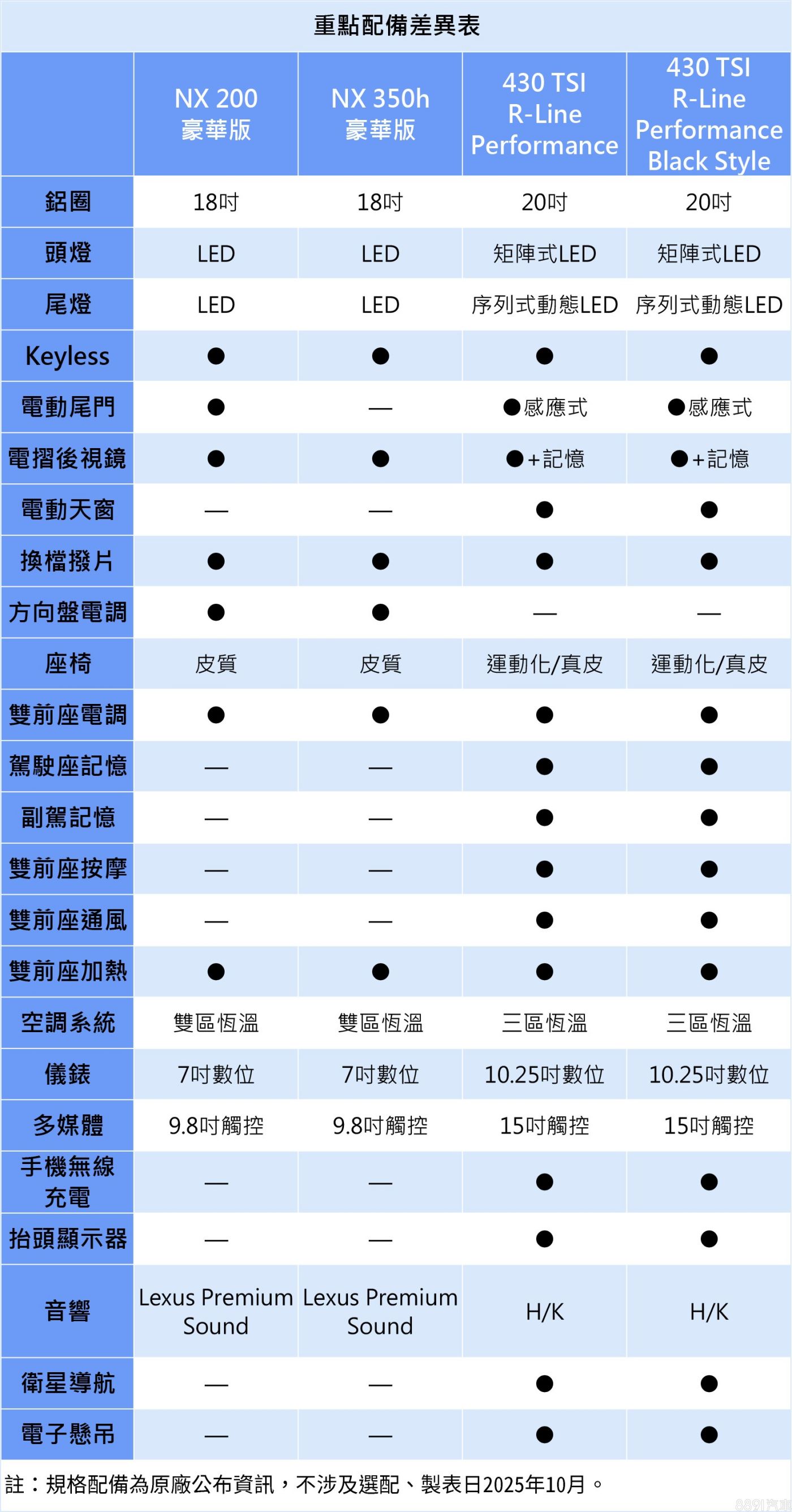 光看配備,Tiguan 430 TSI豐富的配置完勝,NX 200或350h豪華版都顯然有不足之處,前者在車室對於真皮材質的運用,也比起NX 200或350h豪華版大方不少。說實話,若想擁有更多舒適、便利和科技配備,NX車系起碼得至旗艦版以上,才較符合多數人對豪華車的念想。
