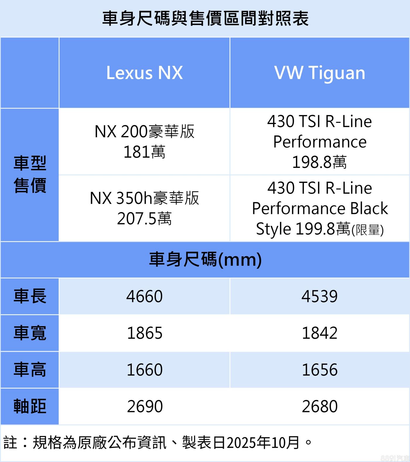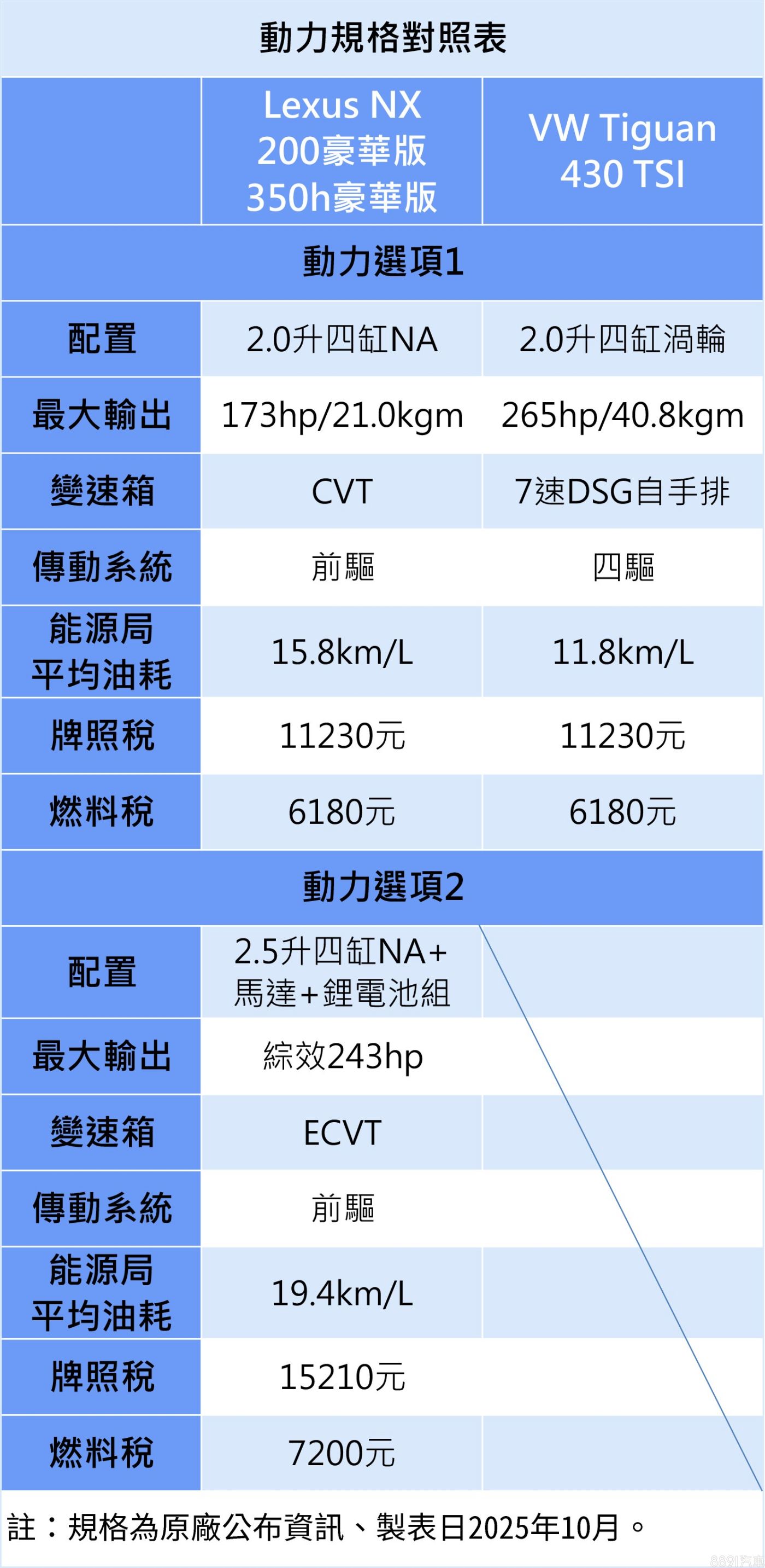 若你想一次買進豪華品牌的質感與信任感,Lexus NX 200或350h豪華版的確是十分穩妥的選擇,除了好入手、豪華品牌的光環,它在全台遍布的服務據點、維修保養價格亦相對同級親民,加上穩定的二手價,絕對是開得久又放得安心的選項。VW Tiguan頂規車型則以動力和滿配誠意取勝,兩者各有絕招,關鍵在於你想買的是「省心享受」還是「駕馭快感」。