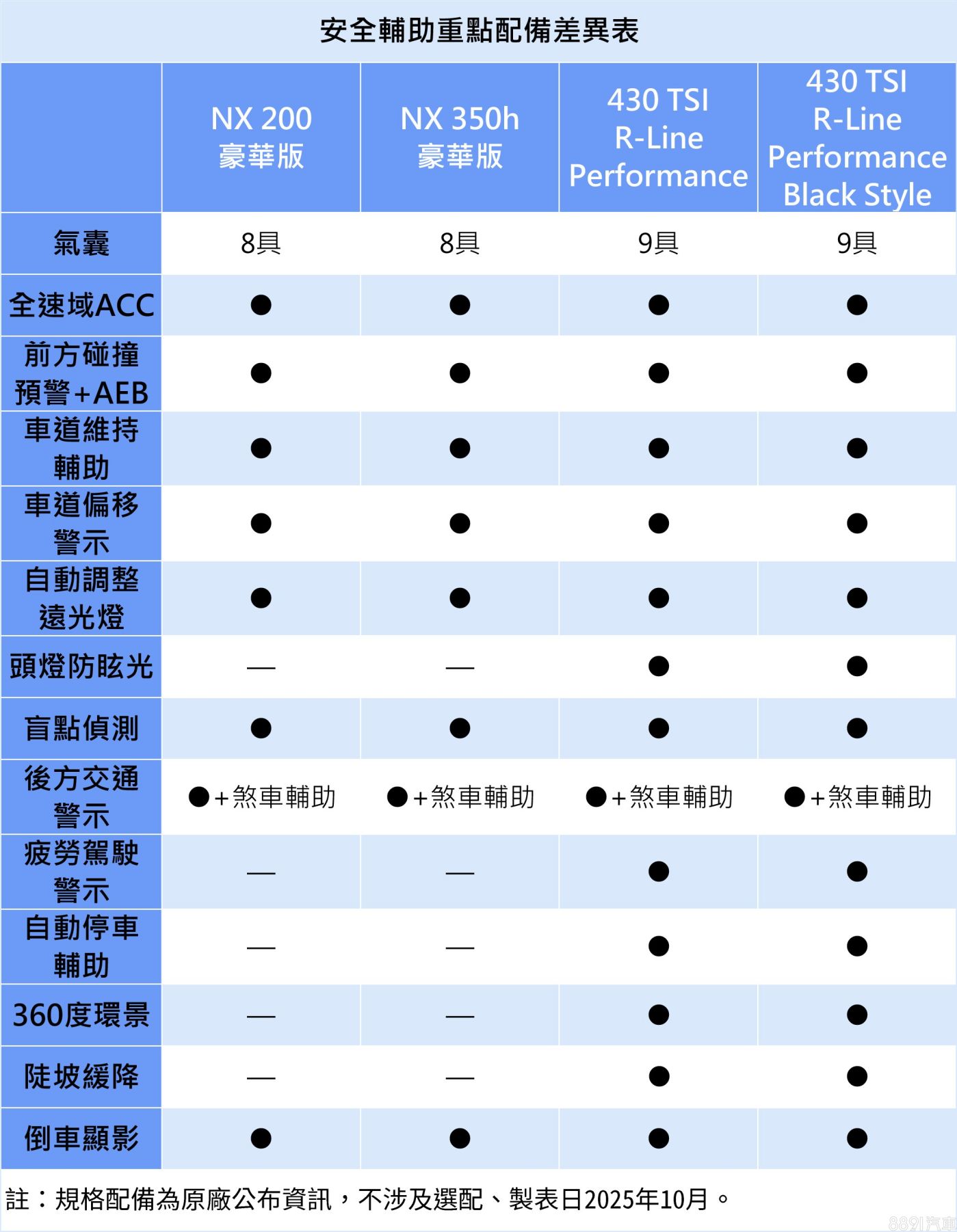 在消費者注重主被動安全的氛圍下,許多車系安全都不分等級,NX和Tiguan也是一樣,符合Level 2駕駛輔助標準這種基本盤肯定是標配,但整體而言,和配備一樣,Tiguan頂規有的像是環景、自動停車輔助,NX 200或350h豪華版都非標配,買NX想擁有還是得入手旗艦版以上車型。