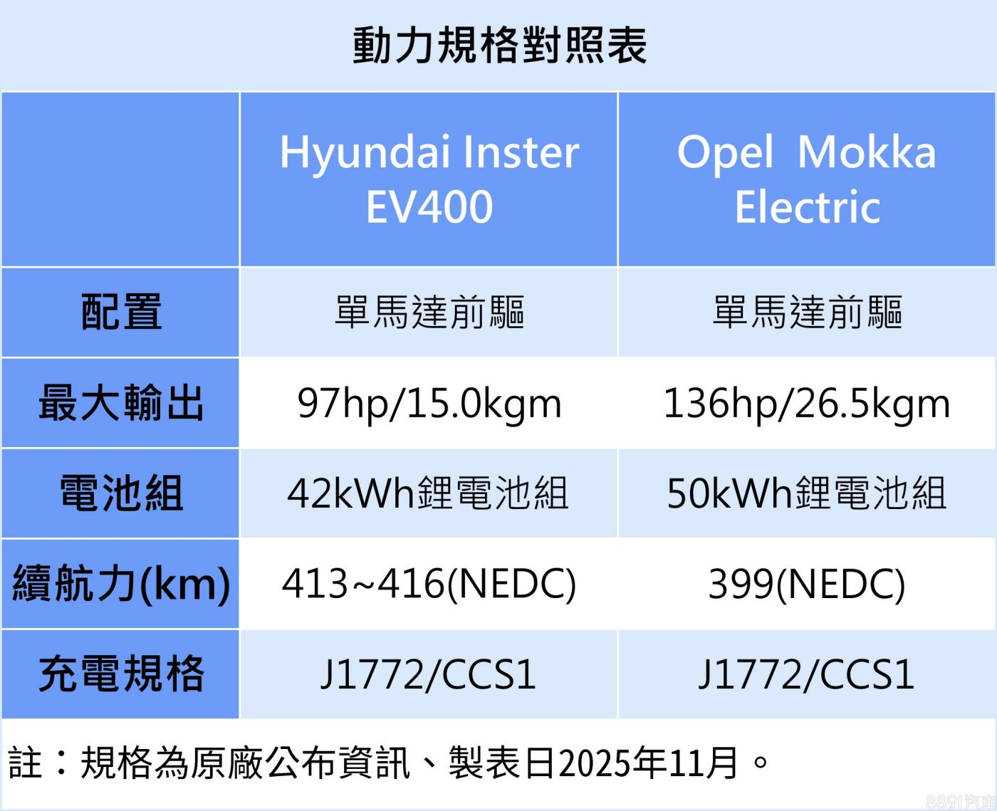 Mokka Electric和Inster均採用單馬達前驅設定,不過前者出力更加充沛。然而,戰場轉到續航力,在相同的標準下,Inster的416km最大續航里程,比Mokka的399km多出一些。