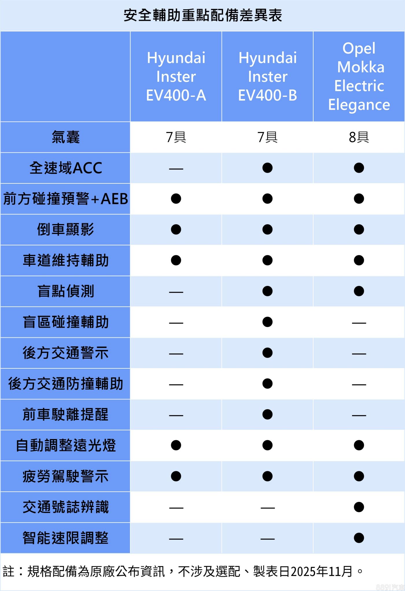 在主動安全科技方面,兩車的策略差異較為明顯。如果你的預算嚴格鎖定在90萬左右,那麼Mokka Electric無疑是更安全的選擇。不過當預算拉高到百萬級距,Inster EV400-B就展現出驚人的競爭力。它不僅具備Level 2,更追加了盲區碰撞避免輔助、後方交通防撞輔助等「主動煞停」功能,安全規格甚至超越了Mokka Electric。