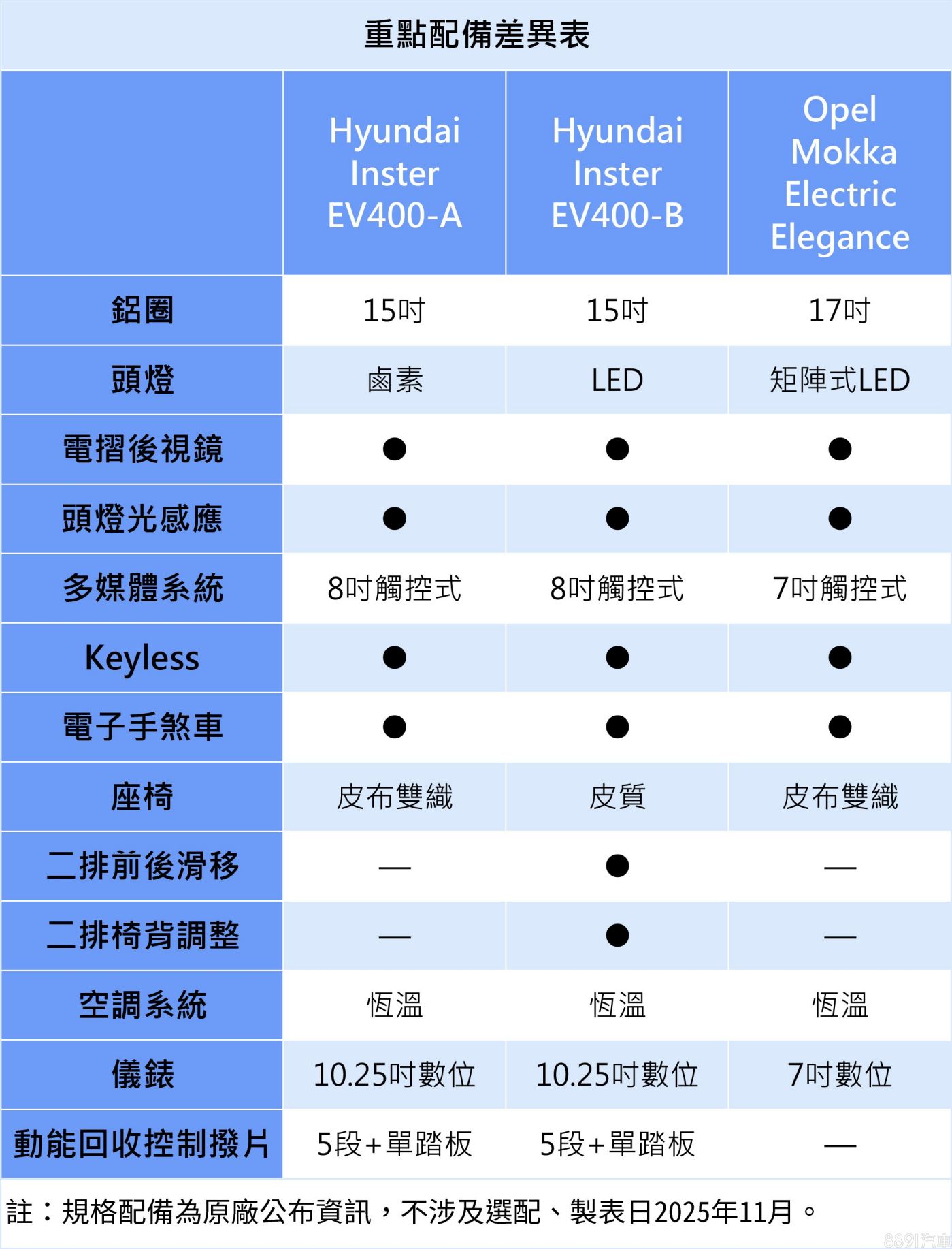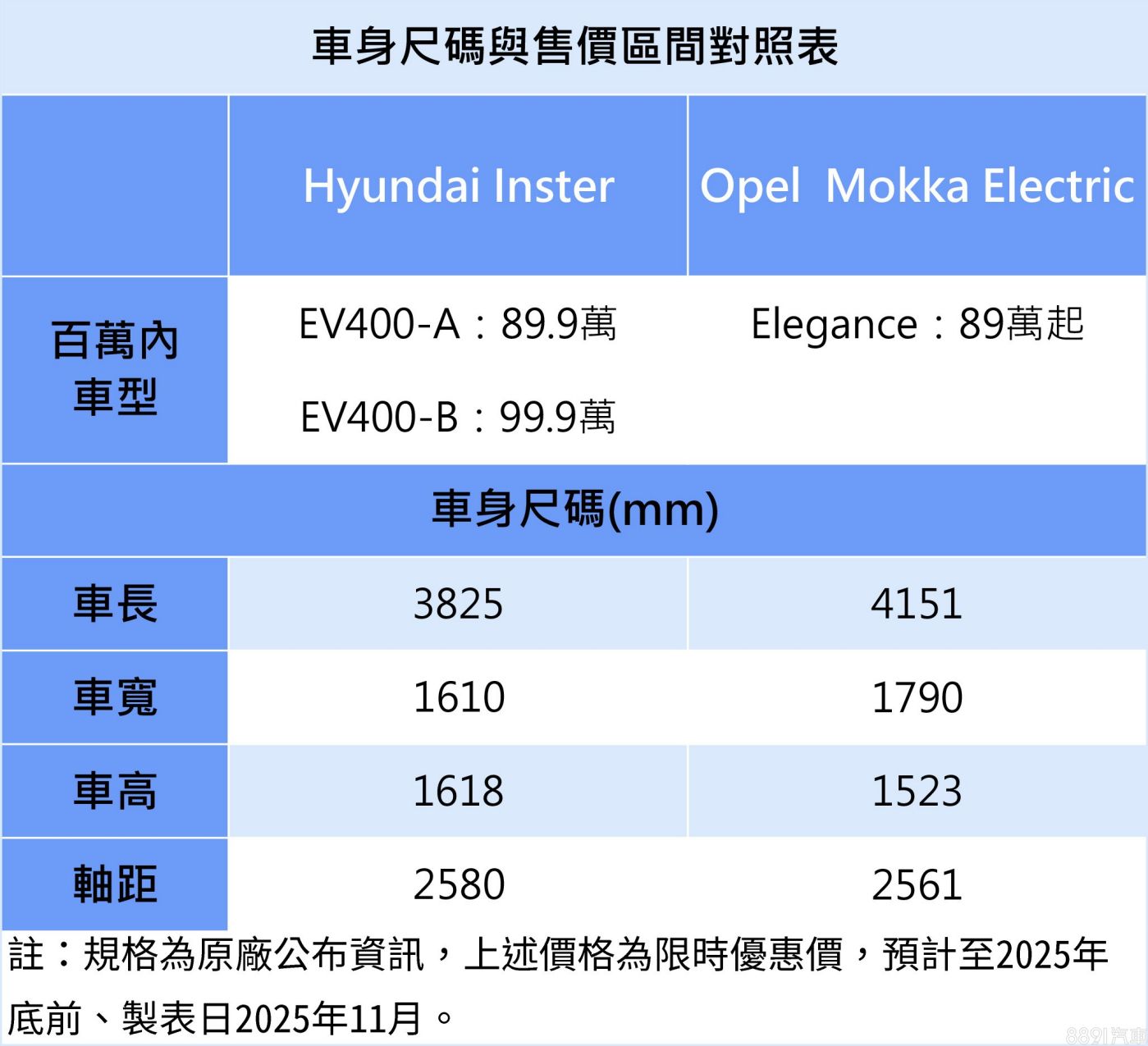 隨著Hyundai Inster以89.9萬起的限時優惠價發表,剛好Opel Mokka Electric正主打89萬起超殺優惠,除了「最便宜」,由於原先開價99.9萬、Luxgen n7入門的五人純粹版目前暫時停止販售,Inster EV400動力車型和Mokka Electric,也成為了台灣百萬內電動車「唯三選」,究竟是韓國後起之秀能勝出?還是德系老牌更得人心?還是得從售價、動力、配備到安全輔助科技,進行全方位的比較!