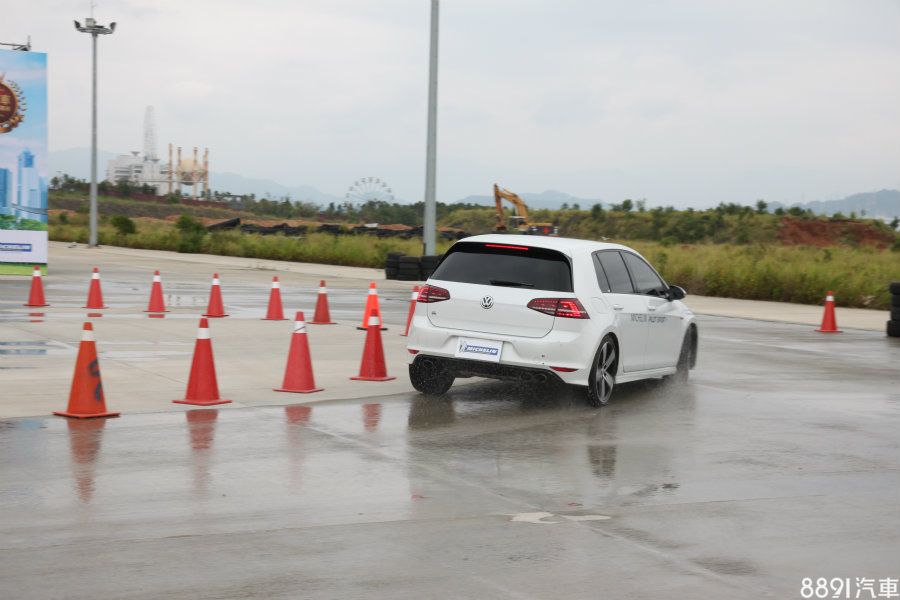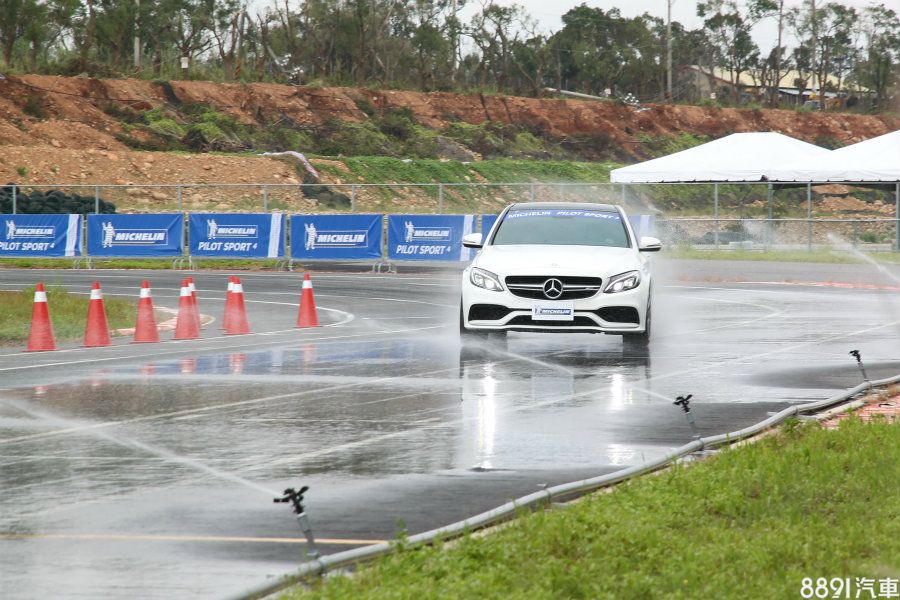 第一輪以配置Pilot Sport 4的車輛開始,在四圈的繞行過程中,在盡量維持同樣的方向盤轉動幅度下,貼近椎筒進行逆時鐘繞轉,就算稍微時速超過最初設定的40km/h,甚至達到50km/h,車輛仍能保持不錯的循跡性,而既然在安全封閉的場地內,我也在最後一圈時,刻意嘗試大腳油門來讓轉向不足的情況出現,但實際上浮現的推頭程度並沒有心中預想來得明顯,高安定性讓人在溼地中過彎能夠深具信心。至於換到同級競品時,在幾乎相同的速度與駕駛方式下,40km/h以前的感受其實沒有太大差異,要同樣到後半段將出彎加速點提前時,排水性表現的落差也開始浮現,推頭狀況較為明顯,車輛也開始偏離既有的行駛路線。