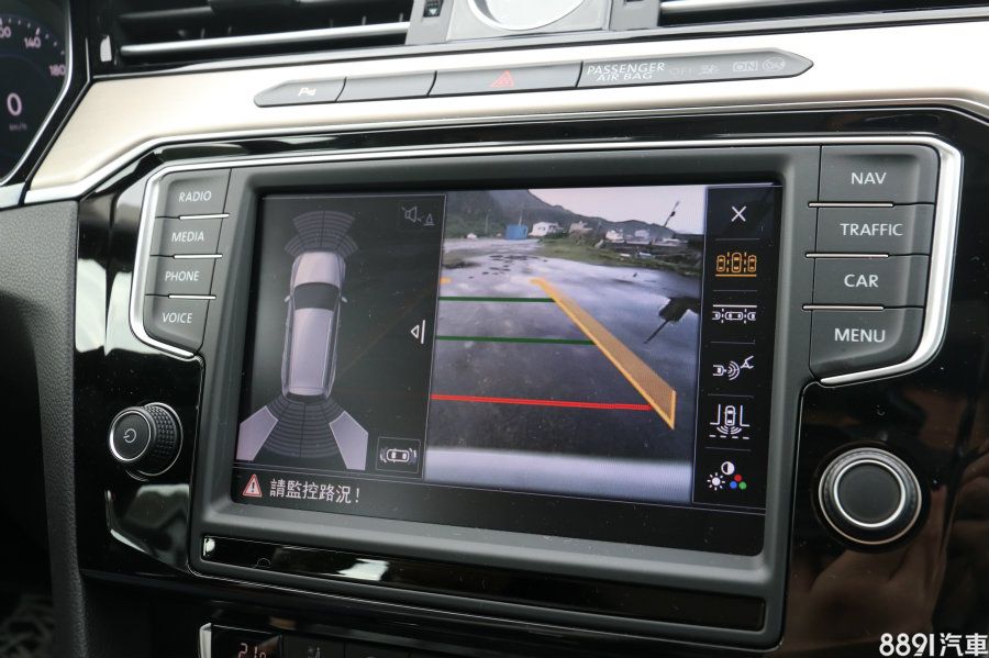 倒車顯影採分割畫面,左側為雷達測距,右側為後方畫面顯影,而在Highline車型另可透過2萬元選配360度環景與Park Assit自動停車輔助系統,可以根據車側與車頭尾的攝影鏡頭,投影出周圍影像,停車時會有更好的判斷依據。