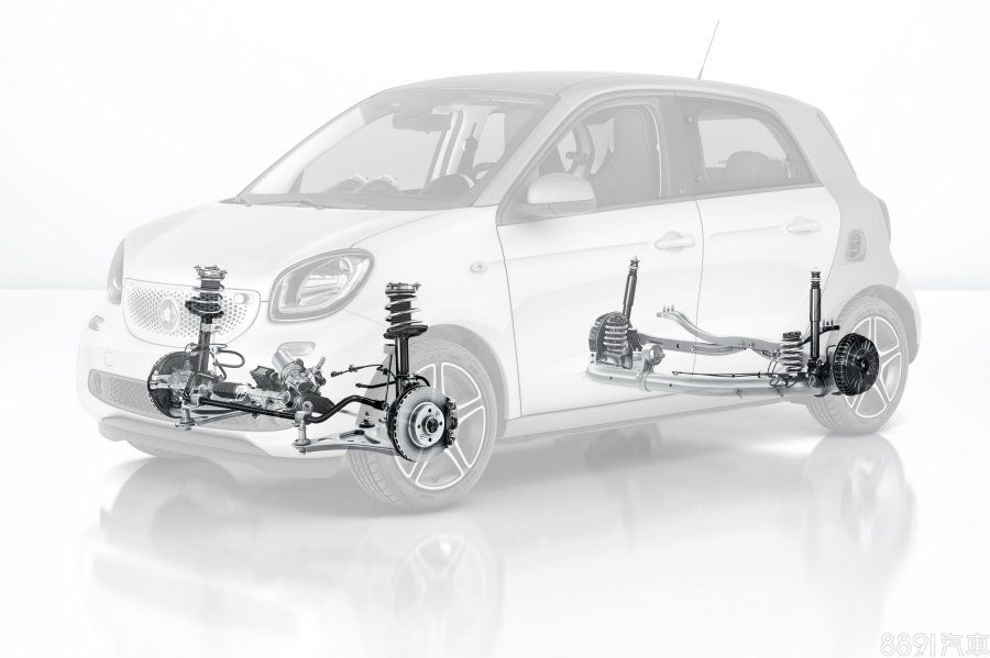 新世代fortwo與forfour同樣採前麥花臣、後de-dion懸吊結構,並在前懸吊的橫向控制臂與後懸吊的減震筒重新設定,加上略為加寬的車體提升穩定性,而後方的de-dion結構屬於非獨立式懸吊之一,其懸吊幾何與拖曳臂類似,原廠將其改進,包括將減震筒重新設計,可盡量讓車輪與地面保持垂直,獲得更好的貼地表現,國內車迷可能比較陌生的Alfa Romeo 75,即是用上後de-dion懸吊的結構。
