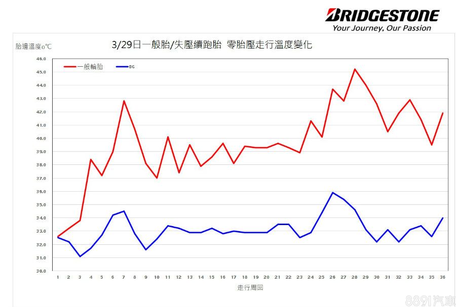 原廠也提供了每趟的胎壁溫度紀錄表,當然每位試駕人員對於油門與煞車的掌控不同,造成每趟數據的差異,但可以確定的是,一般輪胎溫度明顯高於DriveGuard失壓續跑胎,足以證明此DriveGuard的奈米科技與冷卻鰭等技術,在失壓的情況下,更能有效減緩溫度對於胎壁的破壞。