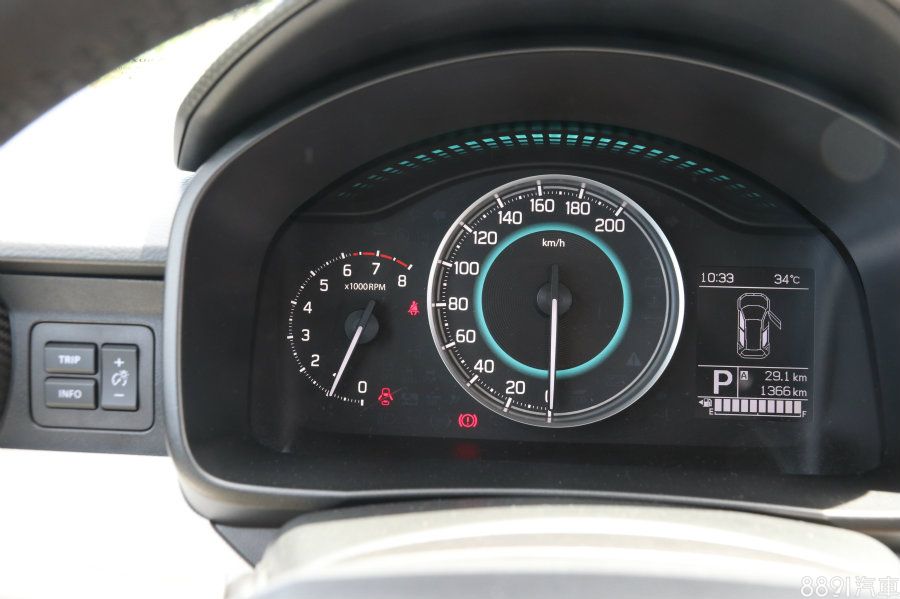 駕駛儀錶由左至右分別是引擎轉速、時速以及各項旅程資訊顯示幕,雖然造型簡單,但行車資訊該有的都有,不因入門便宜而有犧牲;上方與時速錶中央都有藍綠色的背光點綴,能多少增進質感,此外,在圖中最左側備有儀錶資訊幕的切換按鍵「INFO」,但是在方向盤上,也有個相同功能的「INFO」鍵,重複配置,讓人心中產生問號。