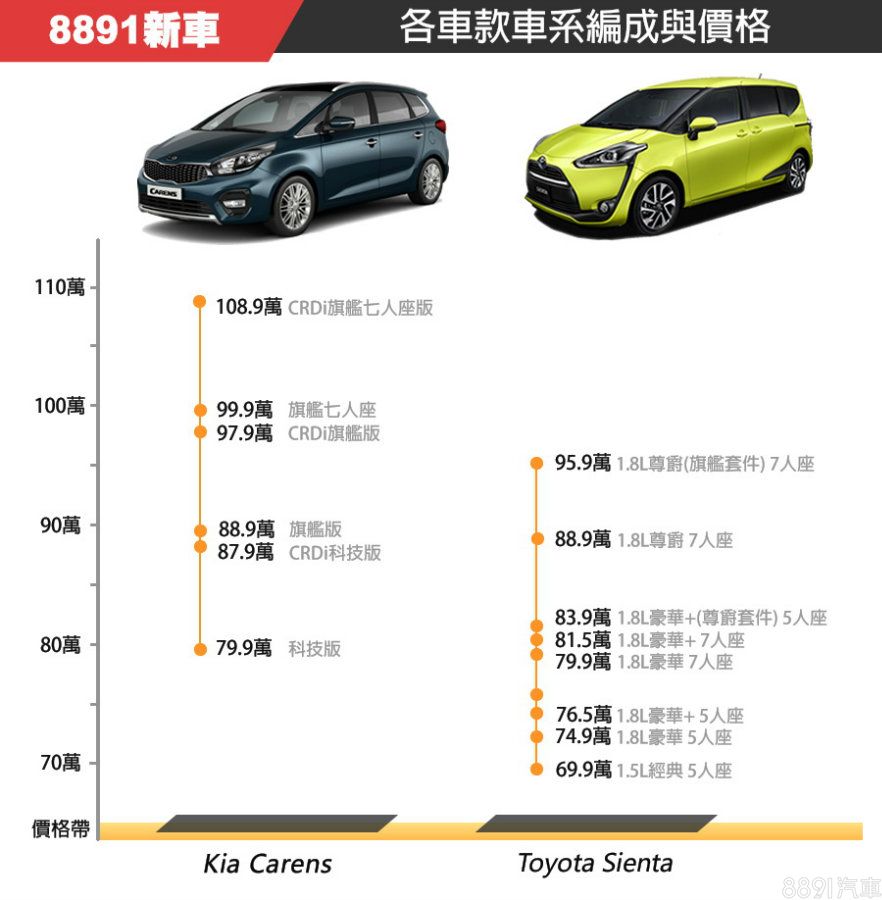 在台灣,如果預算在百萬內,能夠選擇的7人座車款實在不多,不過相信仍有一定的市場需求,例如這次的Carens以及Sienta,7人座車型的起始價分別是99.9萬元與79.9萬元,兩者之間看來有不小價差,但因為Carens不論汽油或柴油車型,都將7人座列為頂規版本,而Sienta則提供入門的7人座車型,相較下,Sienta有更廣泛的價格帶讓消費者選購,至於這次挑選的等級,分別是99.9萬元的Carens旗艦7人座與95.9萬元的Sienta 1.8L尊爵(旗艦套件),價格算是頗為接近。