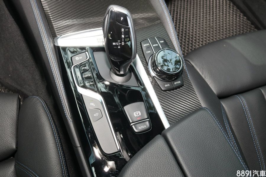 這套動態行車模式切換也是重點(BMW買家特愛),這套功能就安排在排檔桿左方,切換鍵由上而下分別印著Sport、Comfort、Eco Pro。此外,動態行車模式切換按鍵左方還有一顆ADAPTIVE功能,這是因為M550i xDrive搭載主動懸吊,相當於與Audi Drive Select中的Auto功能。一開始,你會質疑ADAPTIVE是不壞掉了,但是多開一段時間,你會發現這套主動懸吊還是能幫助車身維持平順,儘管功效不甚顯著。
