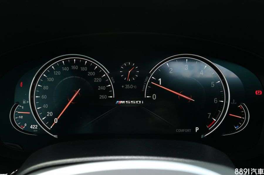這套數位儀錶中央會持續顯示M550i字樣,可以隨著駕駛模式改變燈色與顯示分配,Comfort模式是一般的黑底白標示,Sport模式時背光轉成戰鬥紅色,Eco Pro則是象徵環保的藍色,此外, 260km/h的時速錶底和一般5系列相同,相信舉解除限速後,以M550i實力而言可以輕易破錶!