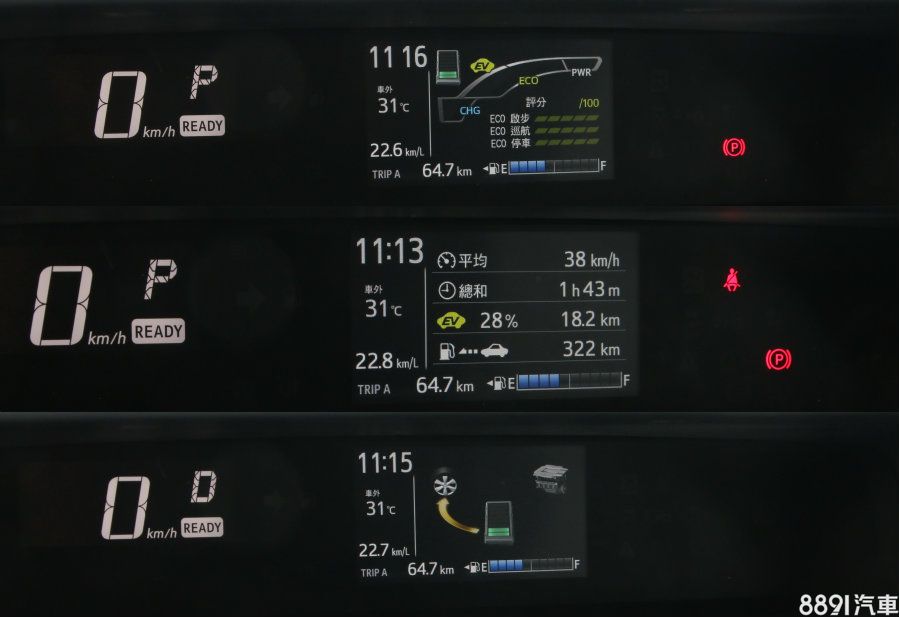 Prius c以中控上方的兩組液晶螢幕提供各項行駛資訊,右方的液晶螢幕由原本的3.5吋放大至4.2吋,主要顯示內容仍是Hybrid系統狀態、油耗資訊與ECO行駛分數等,由於設計較特別,看慣傳統儀錶位於方向盤前面的人,需花一點時間適應。