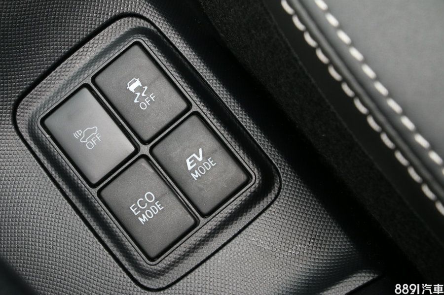 「純電行駛警示音」、「VSC車身穩定系統」、「ECO Mode節能模式」與「EV Mode純電力模式」,四個按鈕設置於排檔座後方,其中純電模式則要在電力充足(大約顯示還有四格電力以上)、且車速不高時才能使用。