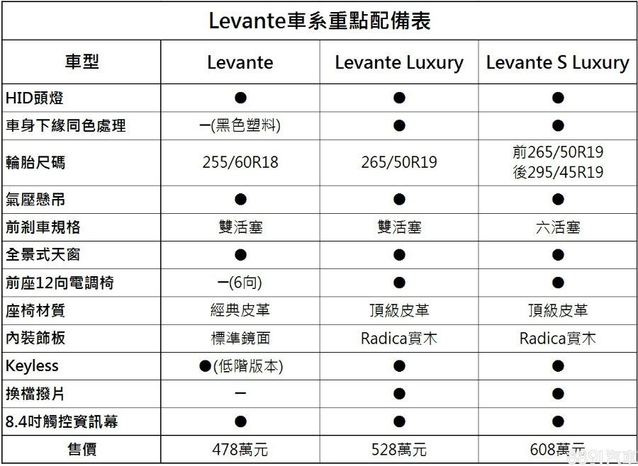 除了初上市時的Levante S,近日則新增兩款車型,採用低輸出的350hp動力版本,價格下調至478萬元起,可望能吸引更多自雙B、Cayenne升級而來的買家。從車系重點配備來看,若衝著品牌魅力而來,畢竟已是接近500萬等級的車,入門的Levante其實也不會太陽春;而主力車型Levante Luxury主要多了更豪華的感官享受,50萬代價相信也不會對客層有太大負擔;至於高階的Levante S Luxury車型,配備上僅多了前六活塞剎車與前後配圈胎組,80萬價差主要是換來430hp的最大輸出,適合追求大動力的熱血買家。