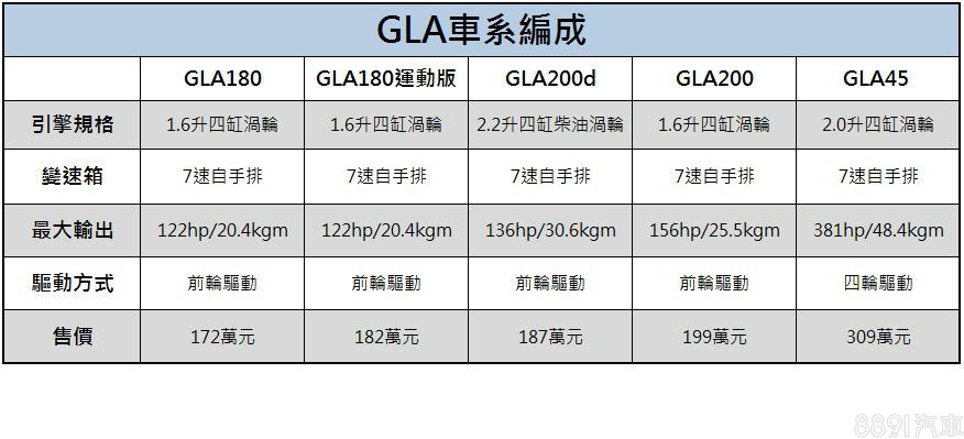 售價方面,除了AMG性能版維持309萬元,其餘均小幅調整1~3萬元,並新增GLA180運動版,價格相較於基礎型的GLA180高了10萬元,配備則增加AMG風格的內外套件與副駕駛座電動調整功能,雖然動力數據看來普通,但整體扮相動感,加上賓士在國內的品牌光環,相信將成為車系主力。