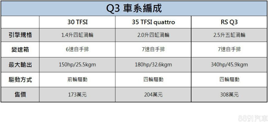 Q3與GLA之間,配備大致在同個水準,不過動力配置就能看出差異,入門的30TFSI,其動力輸出就和目前高階的GLA 200在同個等級,但兩者價差為26萬元,Q3 30TFSI的C/P值高不少,而高一階的35TFSI quattro標配四驅系統,GLA則需攻頂AMG才擁有,是其中差別,不過在性能款的部份,AMG GLA45就明顯勝過RS Q5,整體來看,其實Q3的主力車型C/P值較高,但在地的品牌形象不如賓士,是目前Audi優先努力的目標。