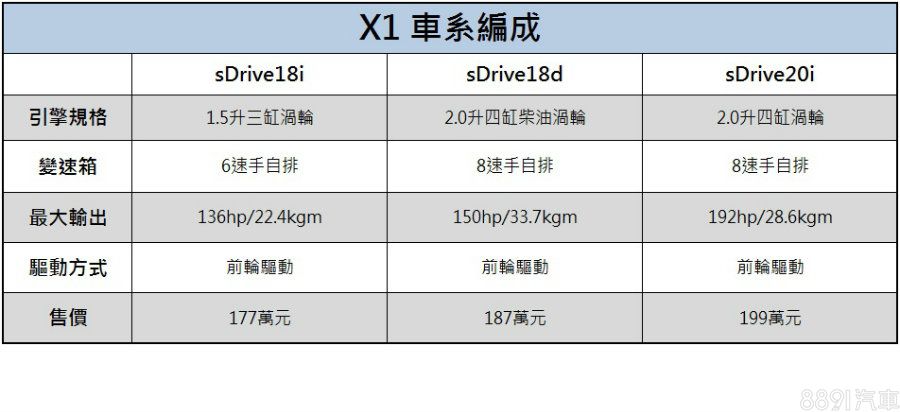 X1在入門兩款的汽油與柴油車型,價格與動力和GLA旗鼓相當(GLA180、GLA200 d),不過GLA 180在小改款後新增標配AMG套件的運動版本,此外,X1並未推出M車型,都是相較GLA所缺少的,但是在X1 sDrive20i的比較就值得注意,與GLA200售價同為199萬元,不過前者的動力高了一級,有明顯優勢,而這其實也會發生在雙B的其他產品上。