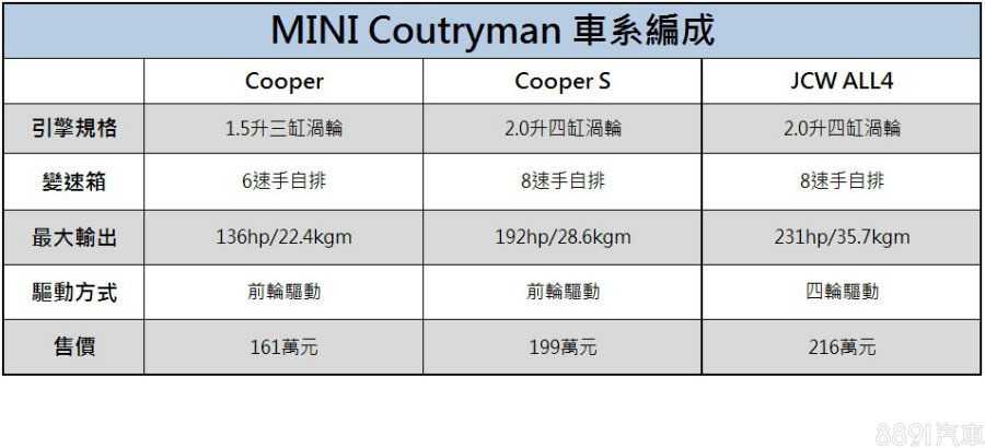 如上文提到,由於Countryman的基礎架構和BMW X1共通,因此Cooper與Cooper S就完全比照X1,動力方面其實對消費者而言,基本的代步、出遊等基本需求都能滿足,不過和X1不同處,就是Countryman多一款JCW的性能版本,並採用四驅配置,此外,還有MINI車款,不論外觀或內裝,向來都有豐富的個人化選配項目,能按照自身喜好打造車輛,秀出車主的品味,只是GLA在這方面也不惶多讓。